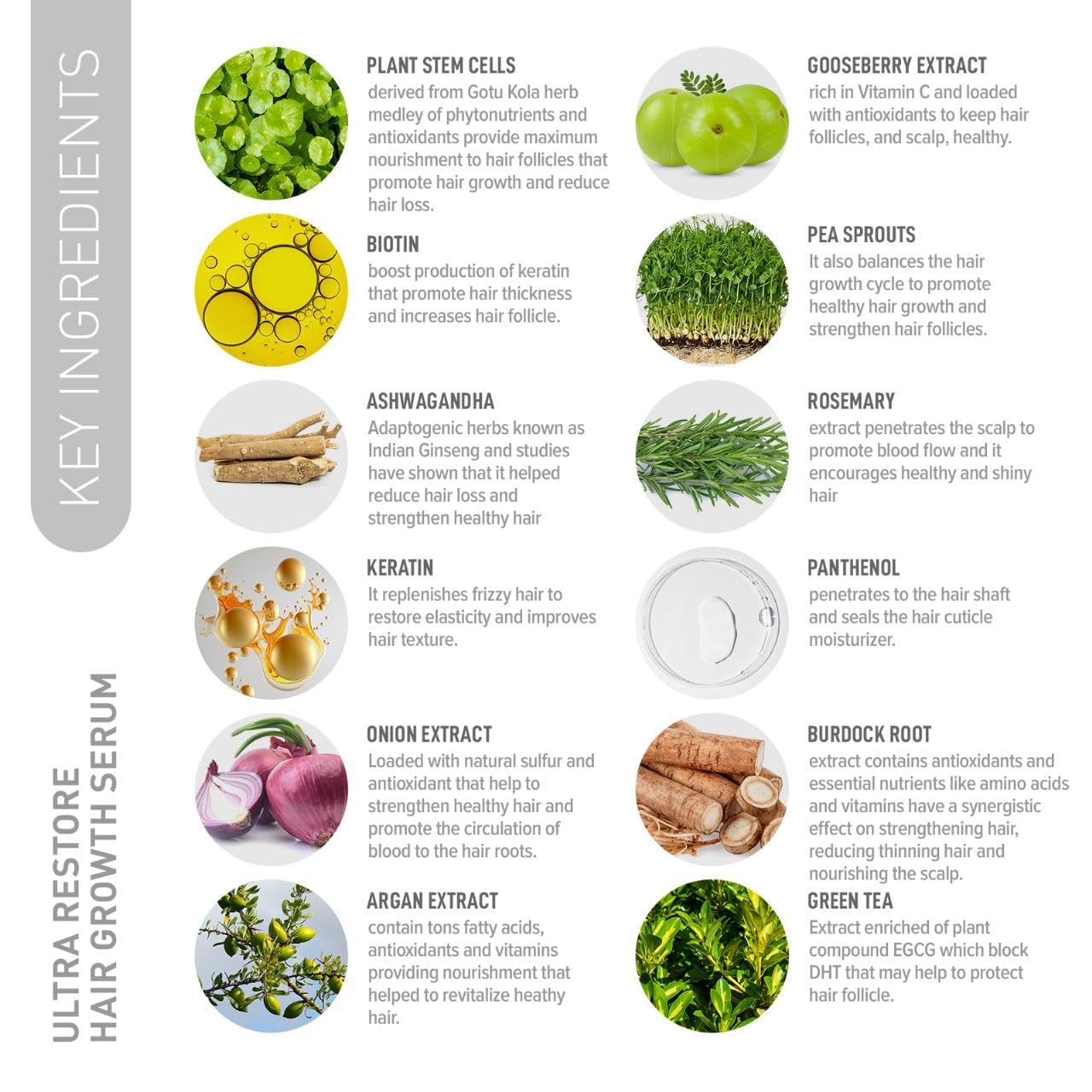 - Active Ingredients : Ashwagandha, Biotin, Keratin, Biotinoyl tripeptide-1, Argan, Citrulline, Arginine, stem cells, Panthenol, numerous amino acids, Niacinamide, Onion extract, Turmeric root Ashwagandha, Biotin, Keratin, Biotinoyl tripeptide-1, Argan, Citrulline, Arginine, stem cells, Panthenol, numerous amino acids, Niacinamide, Onion extract, Turmeric root