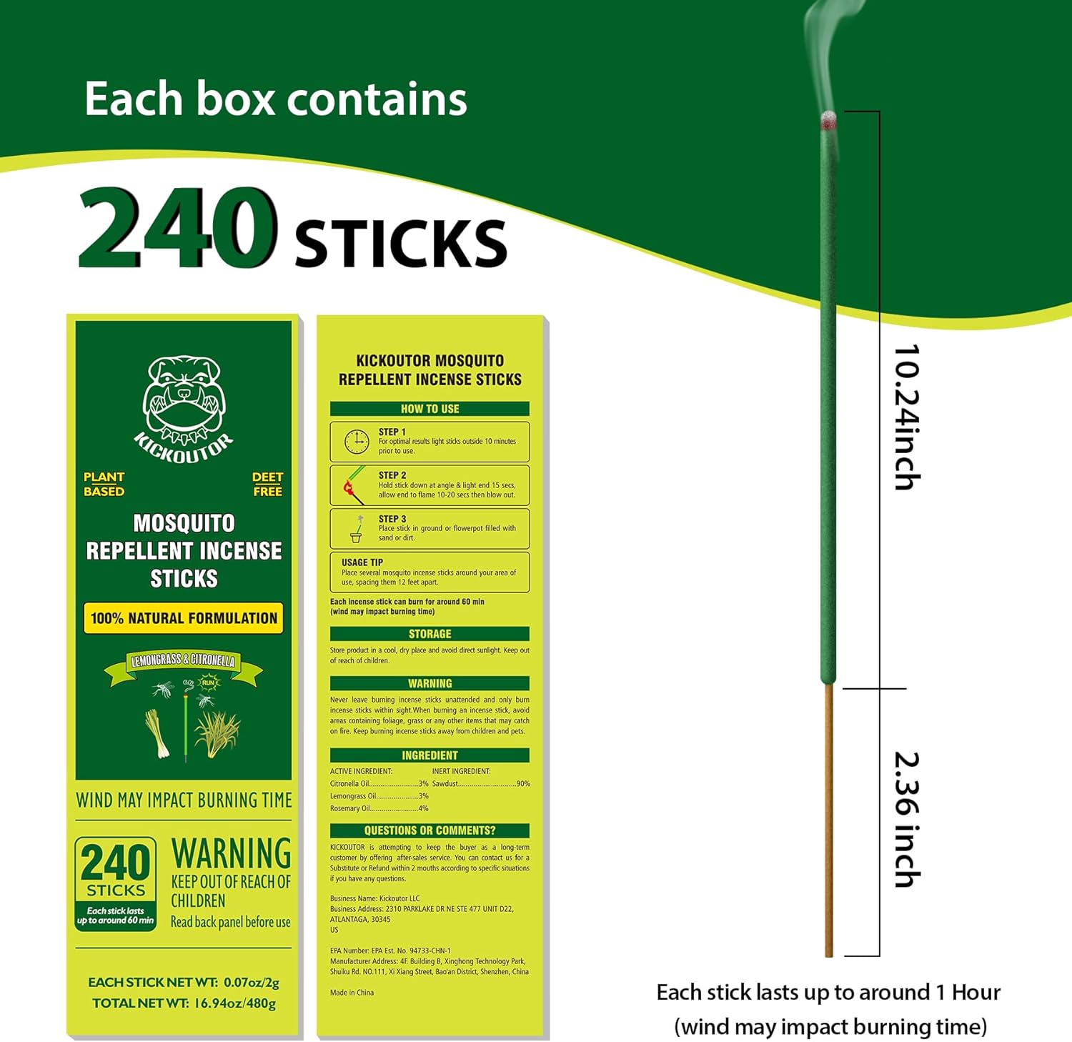 - EFFECTIVE MOSQUITO REPELLENT:KICKOUTOR mosquitoes repellent uses a combination of plant-based repellent oils, which herbal ingredients provide a safe insect repellent effect. Smoke emitted by mosquito sticks will deter buzzing mosquitoes and other bugs itchy bites. Giving you a relaxing atmosphere and keeping you and your family safe from mosquito bites
