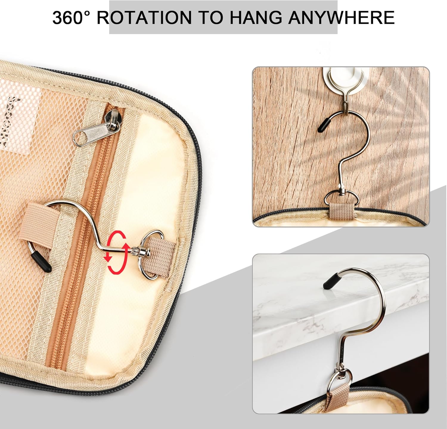 - CONSIDERABLE DESIGN - The elastic band and elastic mesh bag in the main compartment and two side compartments can keep the bottle fixed and upright. It has two waterproof compartments specially used for storing wet items. You can put your wet towel, toothbrush, shaving kit, and leaky cosmetics in it. The 360 degrees rotate metal hook gives you a variety of hanging options.