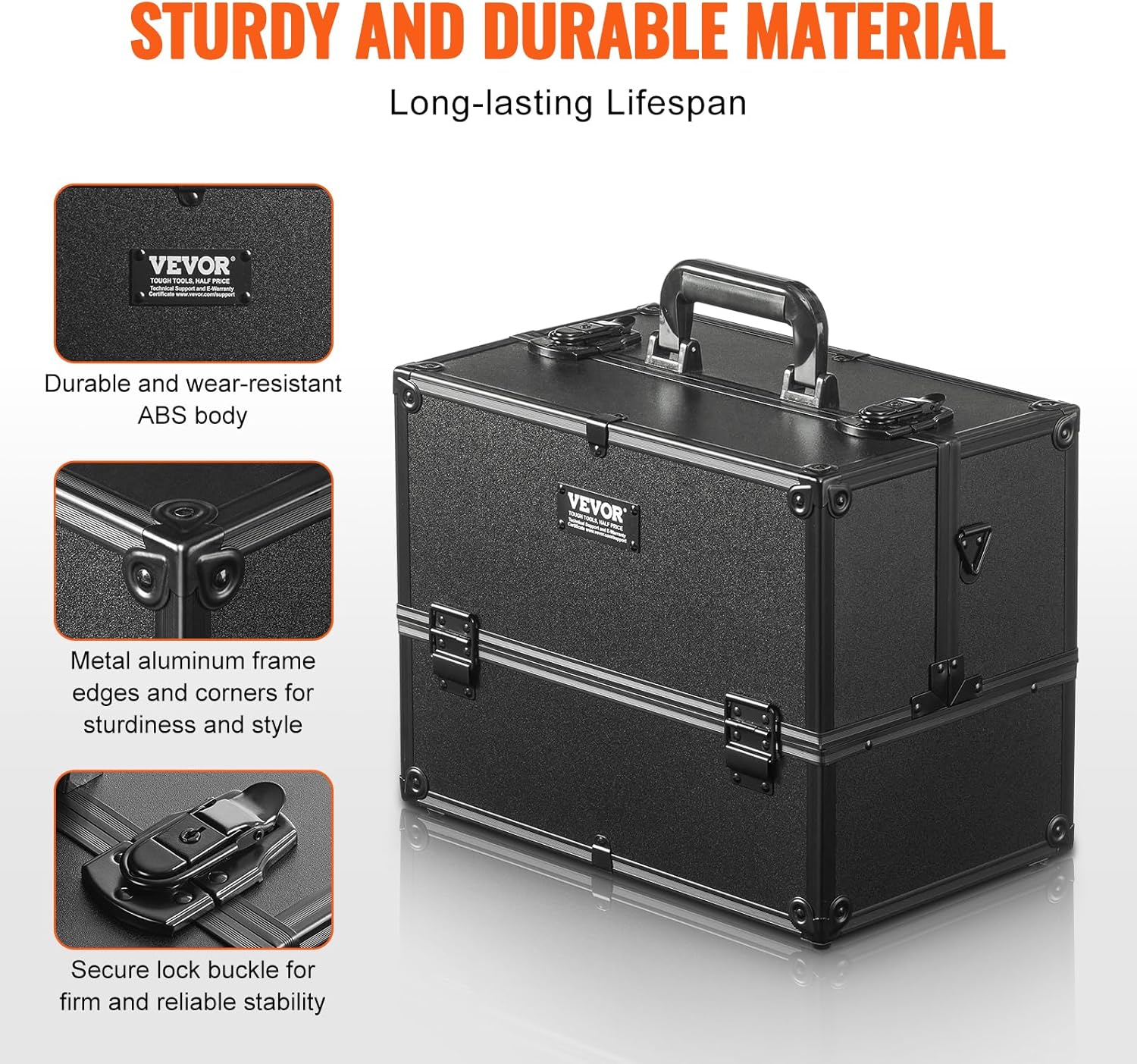 - Sturdy and Durable: The main body of the makeup case is made of ABS plastic, providing high hardness and wear resistance, while the frame and corner joints are constructed with metal aluminum materials, ensuring sturdiness and durability. It also features robust locking clasps to safeguard your items.