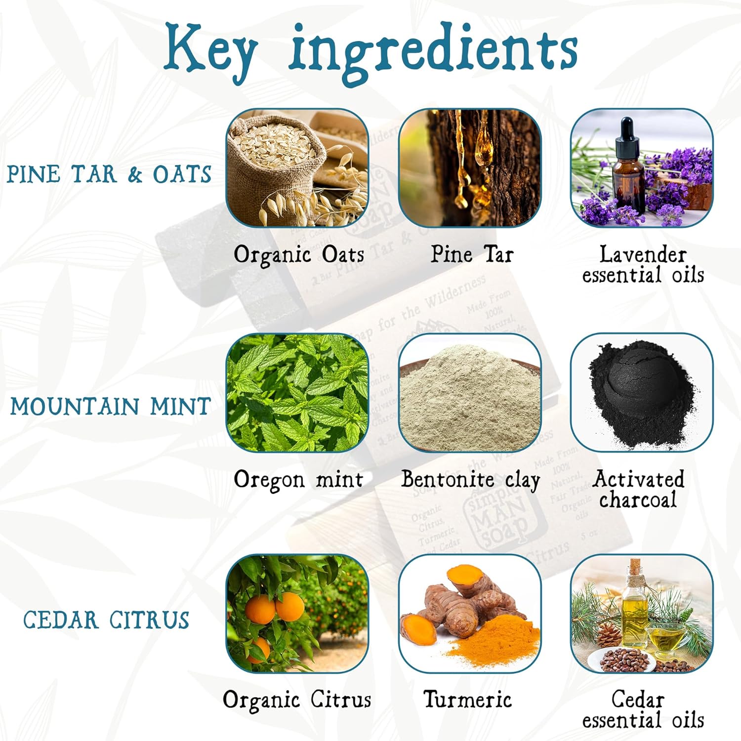 SimpleMan Soap Bar MIX(Pine Tar/Cedar Citrus/Mint)Men’s soap with Organic & Fair Trade Essential Oils-All Natural, Handmade Man Bath Soap Bars-Pack of Six 2.5 Ounce bars(15 Ounces Total)