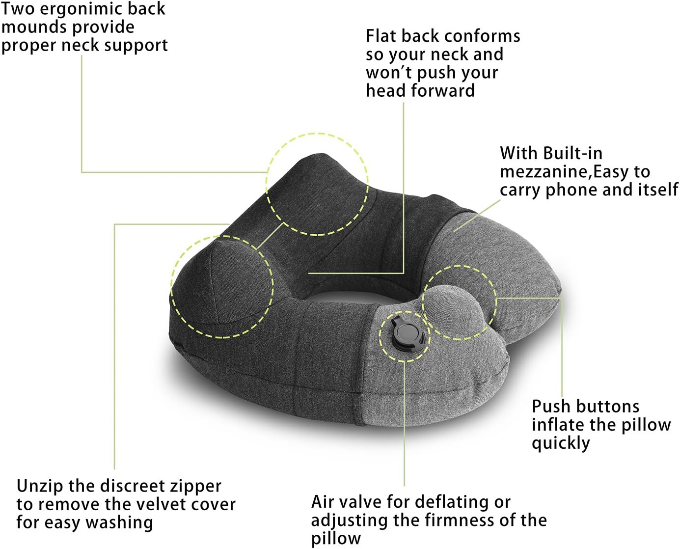 - FASTER INFLATION SPEED: The inflatable travel pillow adopts the most latest invention of push botton inflation is quickly inflated and deflated, press the valve to select your cushion preference. To deflate, simply push the valve to release all the air, roll and easily pack away