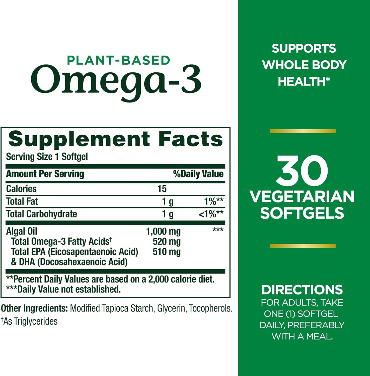 - CONCENTRATED OMEGA-3 SUPPLEMENT (2) Each softgel delivers 1,000 mg of algae oil; providing 520 mg of omega-3 fatty acids and 510 mg of EPA and DHA for overall health and wellness (1)