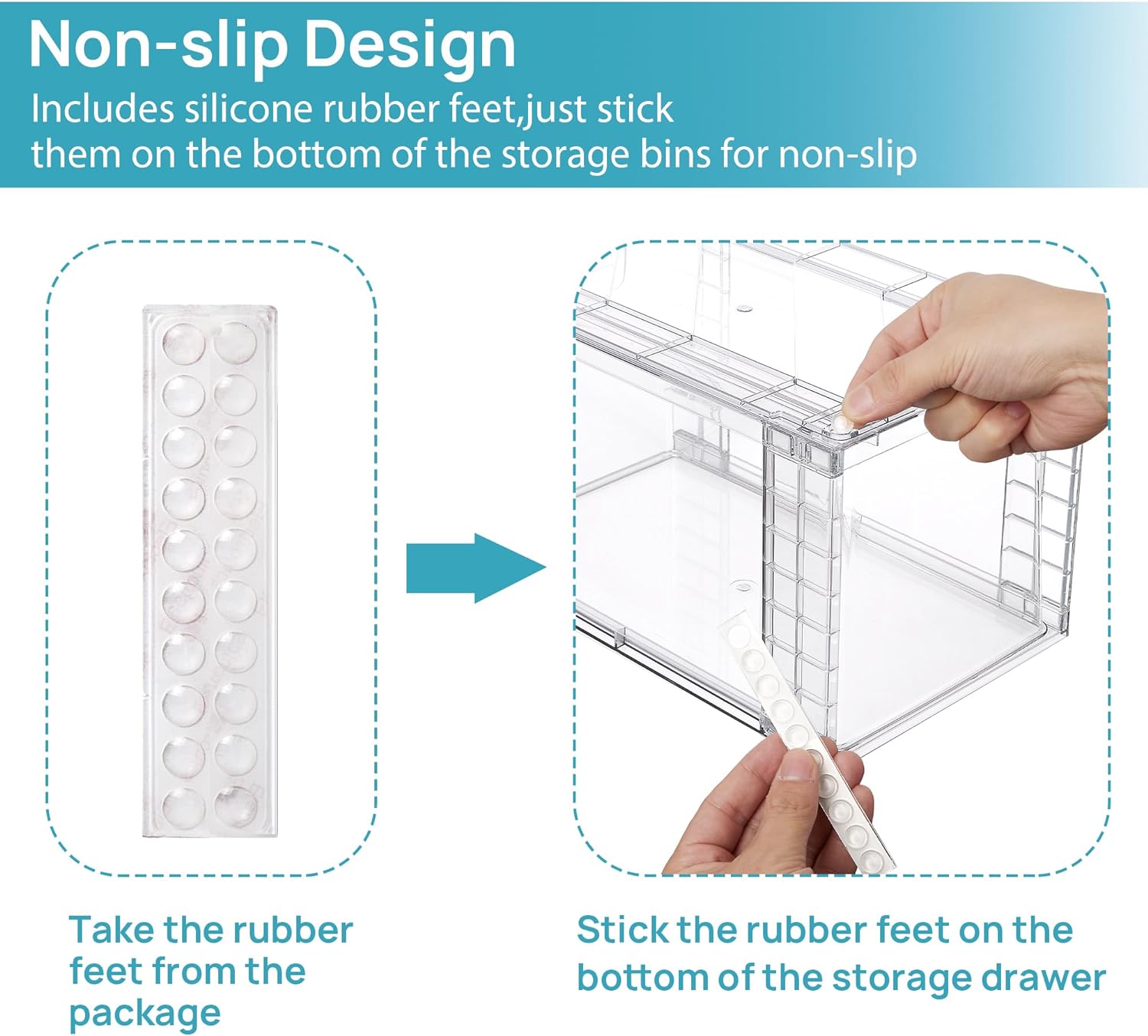 - Built-in Handle and Non-Slip--- Clear organizing containers are designed with pull-out handles, it is convenient to store and take out items.Extra silicone pads are included, add the rubber sticker dots to the bottom,our storage drawers slides in and out very effortlessly and outer frame don't move when pulled out the drawers