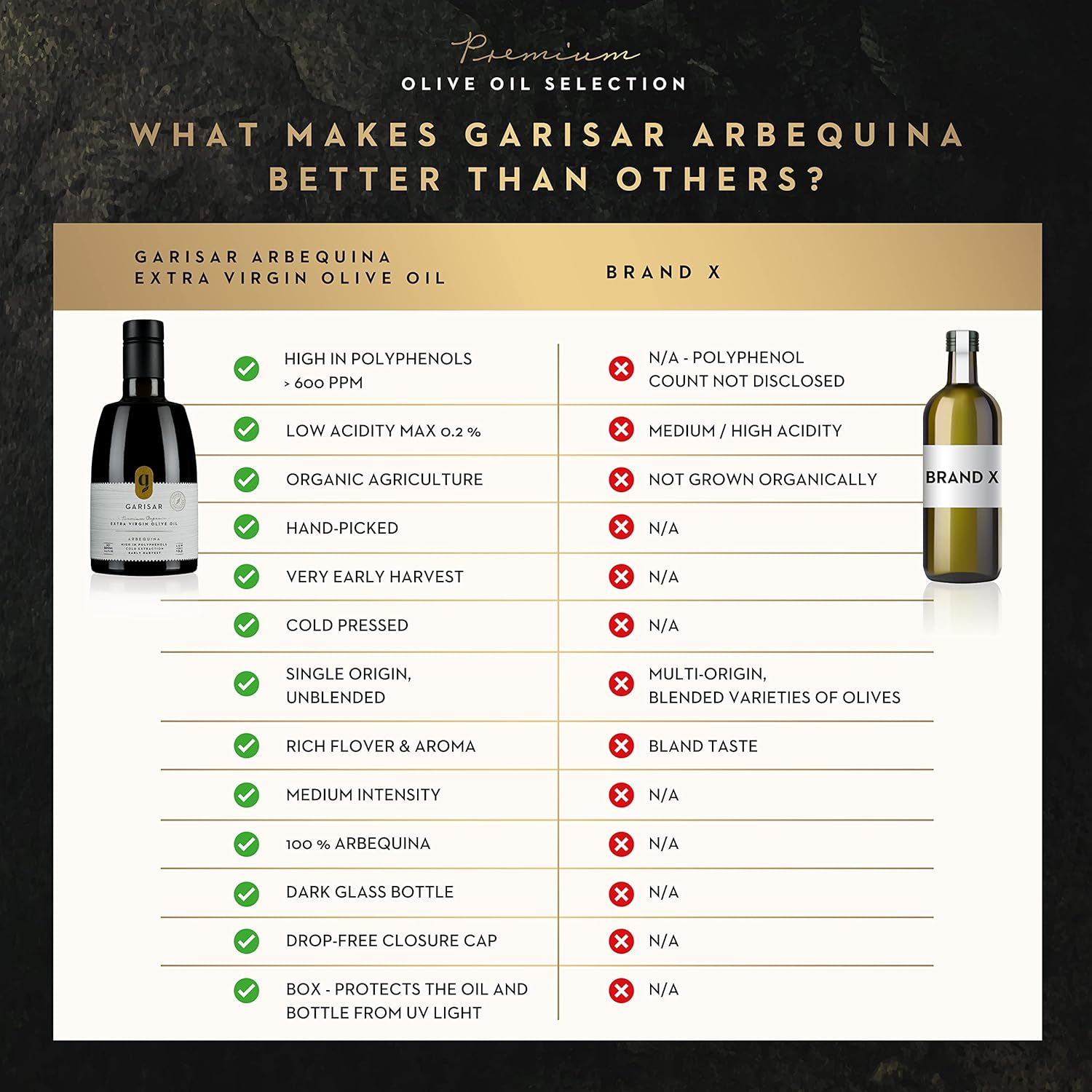 Garisar High In Polyphenol Premium Extra Virgin Olive Oil (>600 ppm), Low Acidity (Max 0.2%), NYIOOC 2025 Gold Medal Winner, Organic Agriculture Hand Picked, Cold Pressed, 100% Arbequina - Pack of 1