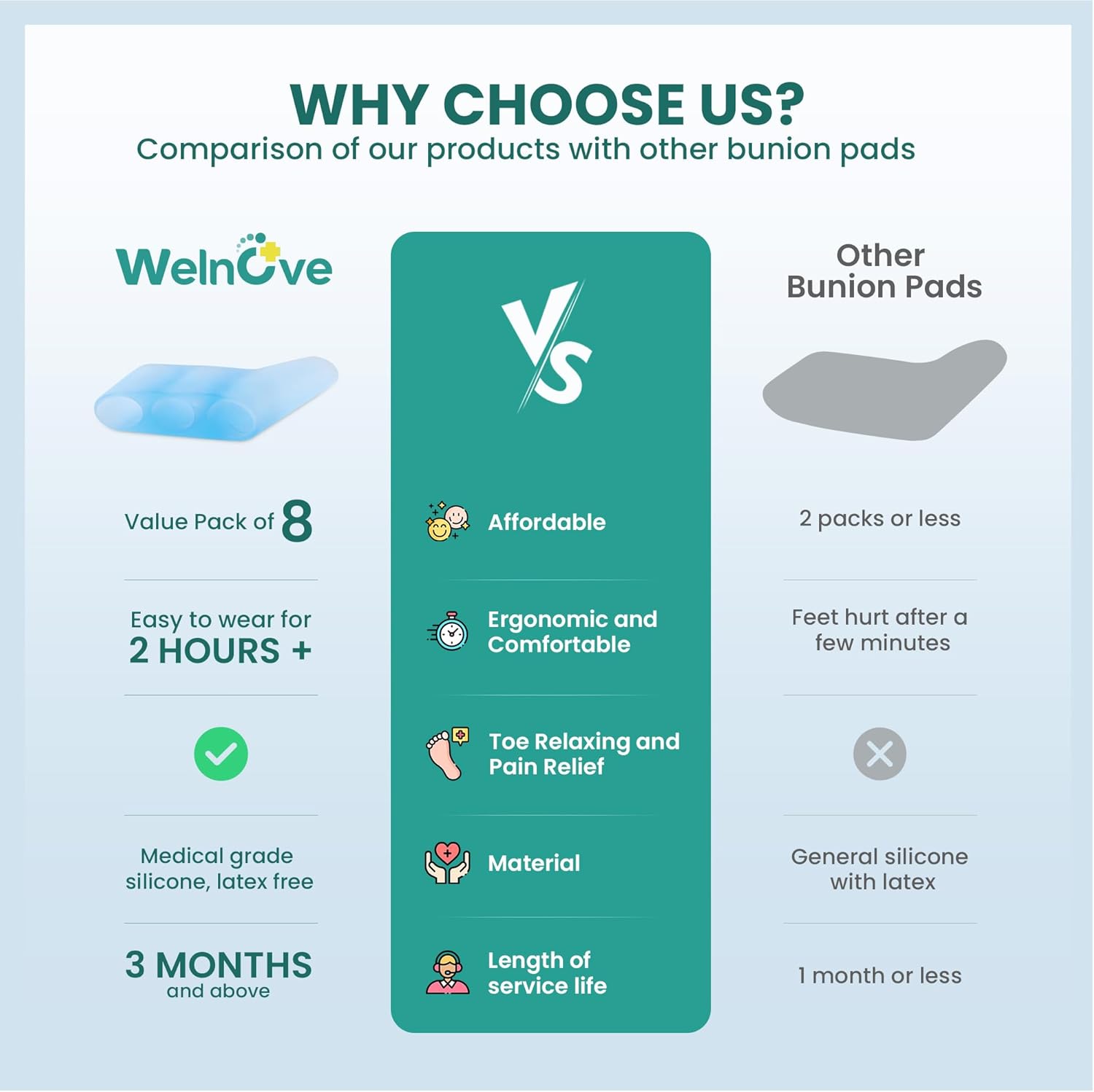 Welnove Gel Pinky Toe Separators - 8 Pack Pinky Toe Spacers, Bunion Cushions Pads for Women&Men, Silicone Little Toe Protectors for Preventing Rubbing & Relieve Pressure(Blue)