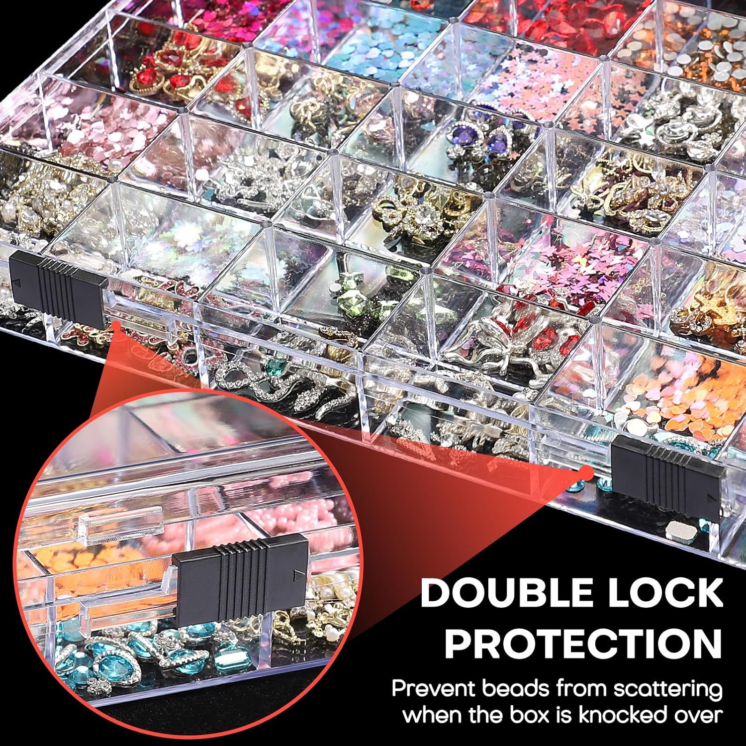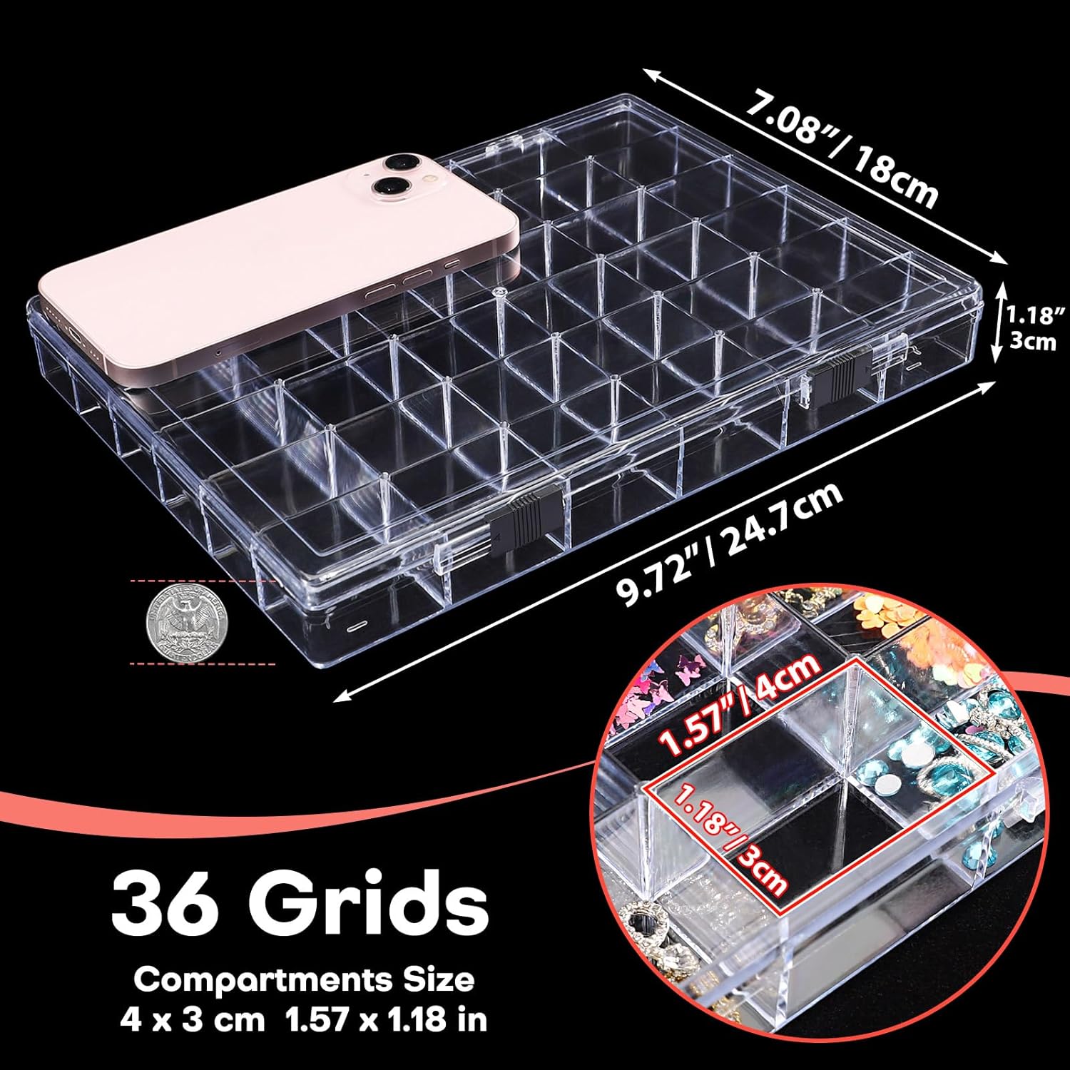 Noverlife 36 Grids Clear Plastic Jewelry Organizer Box, Nail Charm Holder Double Buckle Bead Organizer Storage Container Box, Empty Nail Box Organizer Earring Display Case Acrylic Bead Box for Women