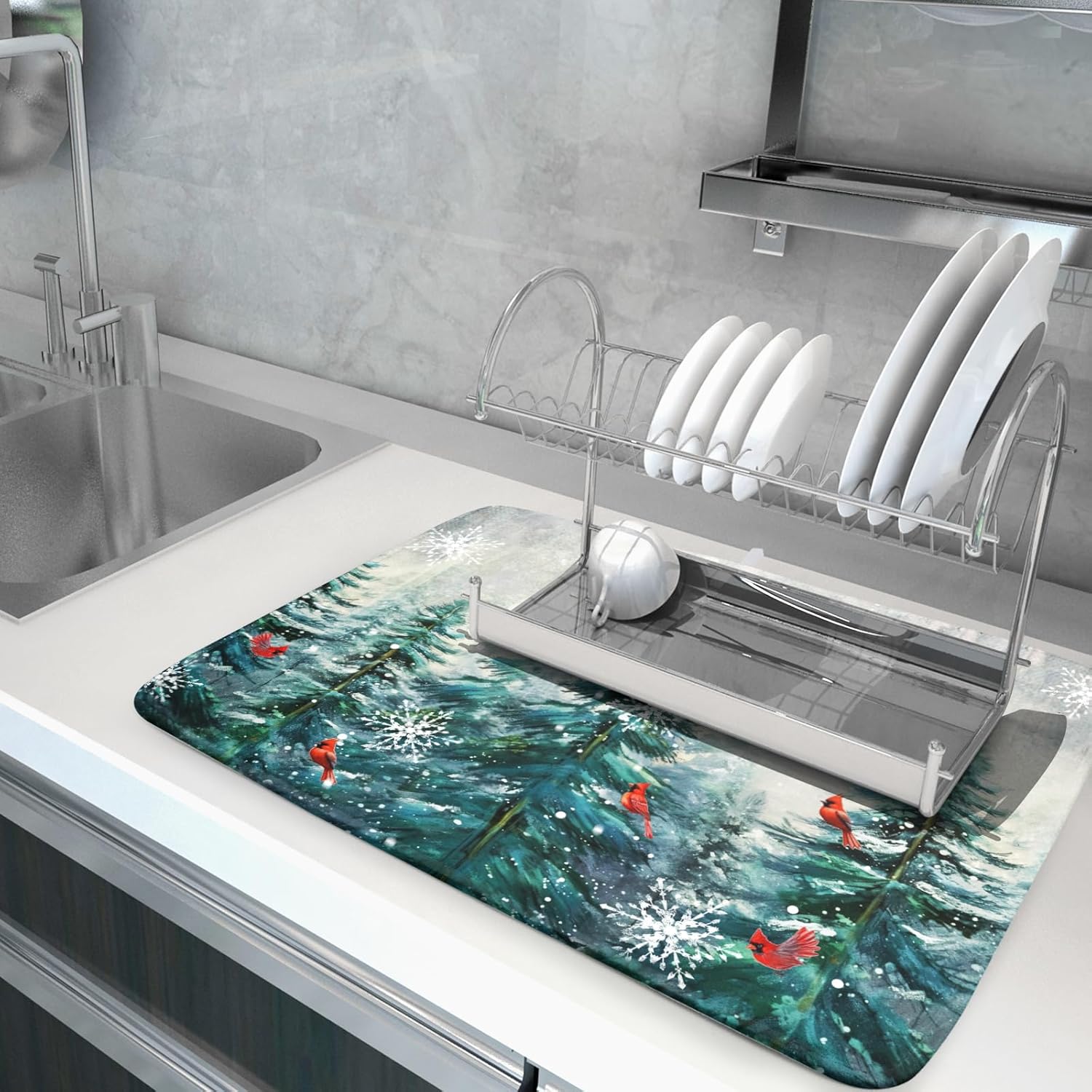 - 【Easy to Storage】This cardinal bird design drying mat with hang rope, soft and foldable, durable, easy to storage it by hanging or folding it up in a drawer or tuck it elsewhere. Perfect for tight spaces like campers, boats and cottages where having a dual purpose item will come in handy.