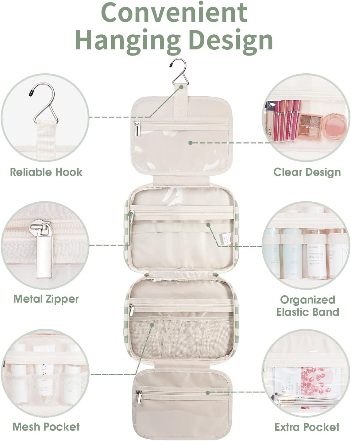 - NOT BULKY DESIGN - Large Capacity yet compact design, weighing 14 ounces. large metal hook allows hanging the toiletry case from towel rack, coat hook or whereever is available, making your toiletries and cosmetics displayed well for easy access