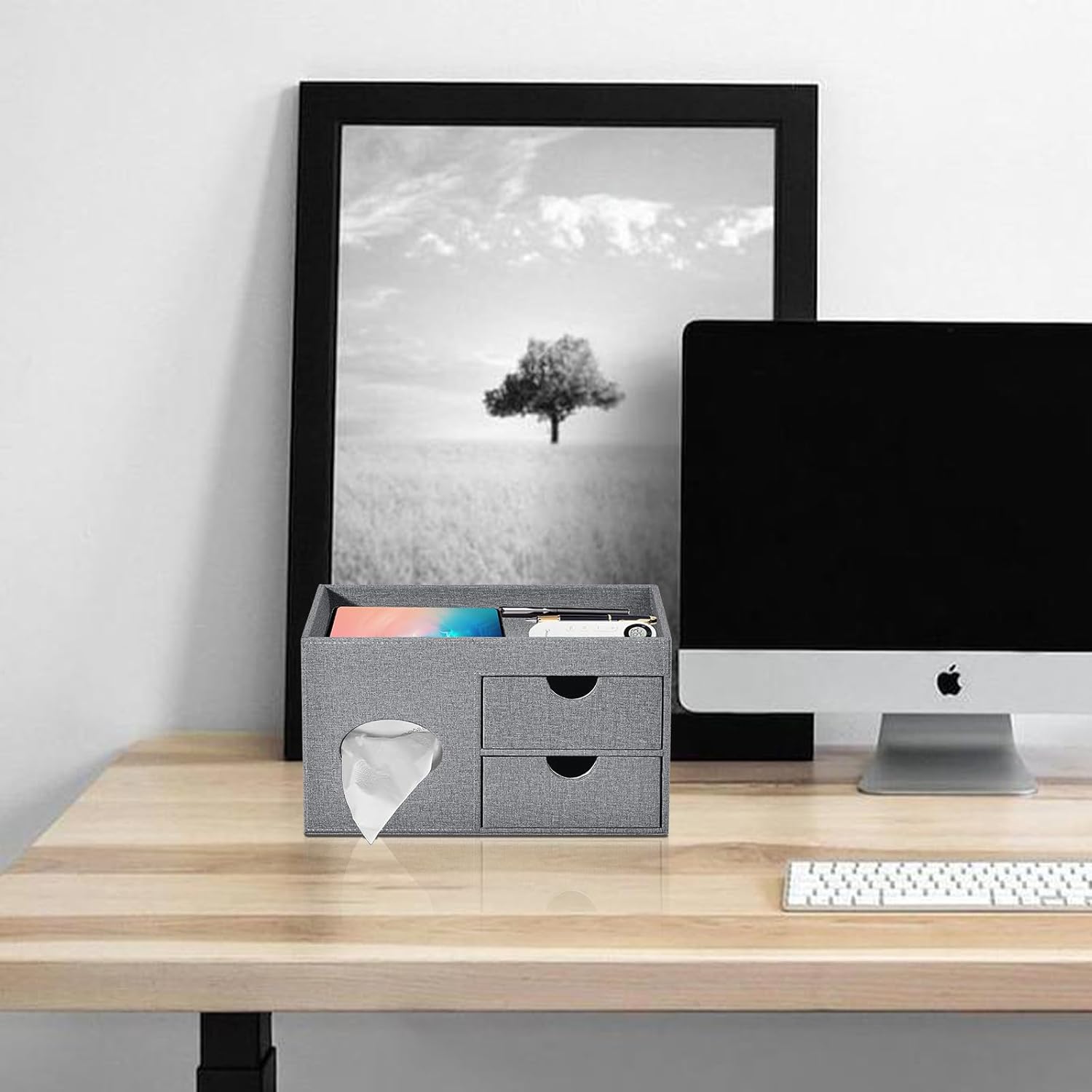 - Multifunctional tissue box lid storage box-The tissue box lid and 1 Storage Tray and 2 Mini Drawer,Very suitable for storing all remote controls ,mobile phone, glasses, or pencils/pens,cosmetics, perfumes,jewelry, Makeup brushes, lipsticks potted plants, etc., Make the desktop well-organized and neat.