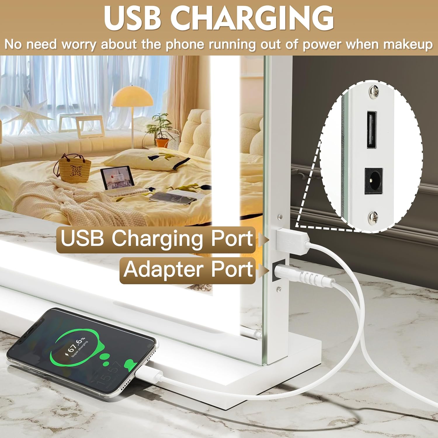 Vanity Mirror with Lights, 32" x 22" Large Lighted Vanity Mirror with Dimmable 3 Modes, LED Makeup Mirror, USB Charging Port, Tabletop or Wall-Mounted Square White