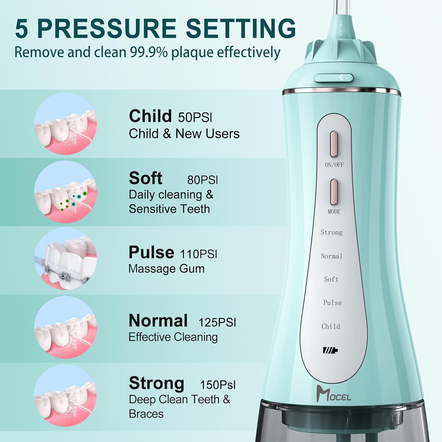 - 【350ML Big capacity & IPX7 Waterproof】Yes, With 350ml water tank! don't need to refill water multiple times. The capacity of our water dental floss is far better than other products. The removable water tank is easy to clean. Water dental flossers picks owns internal water leak-proof design, Mocel oral irrigator prevent water leakage reliably, It can use for shower in the bathroom and it's washable to clean