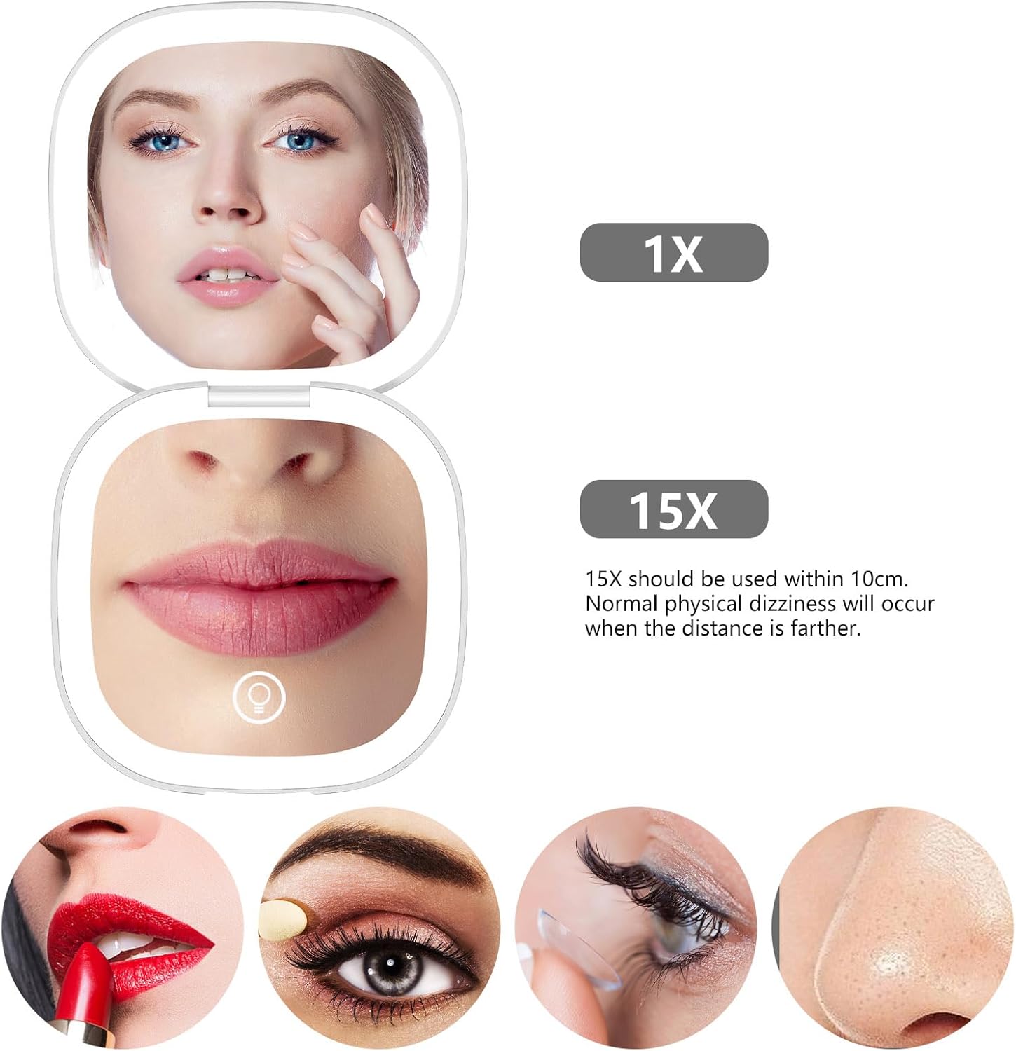 - DUAL-SIDED MAGNIFICATION WITH LED LIGHTS:Featuring a double-sided makeup mirror with standard and 15x magnifying mirror options, this compact mirror with light ensures flawless detail for your beauty routine. The built-in LED lights offer three adjustable color settings, transforming it into a versatile lighted makeup mirror with magnification suitable for any lighting condition.