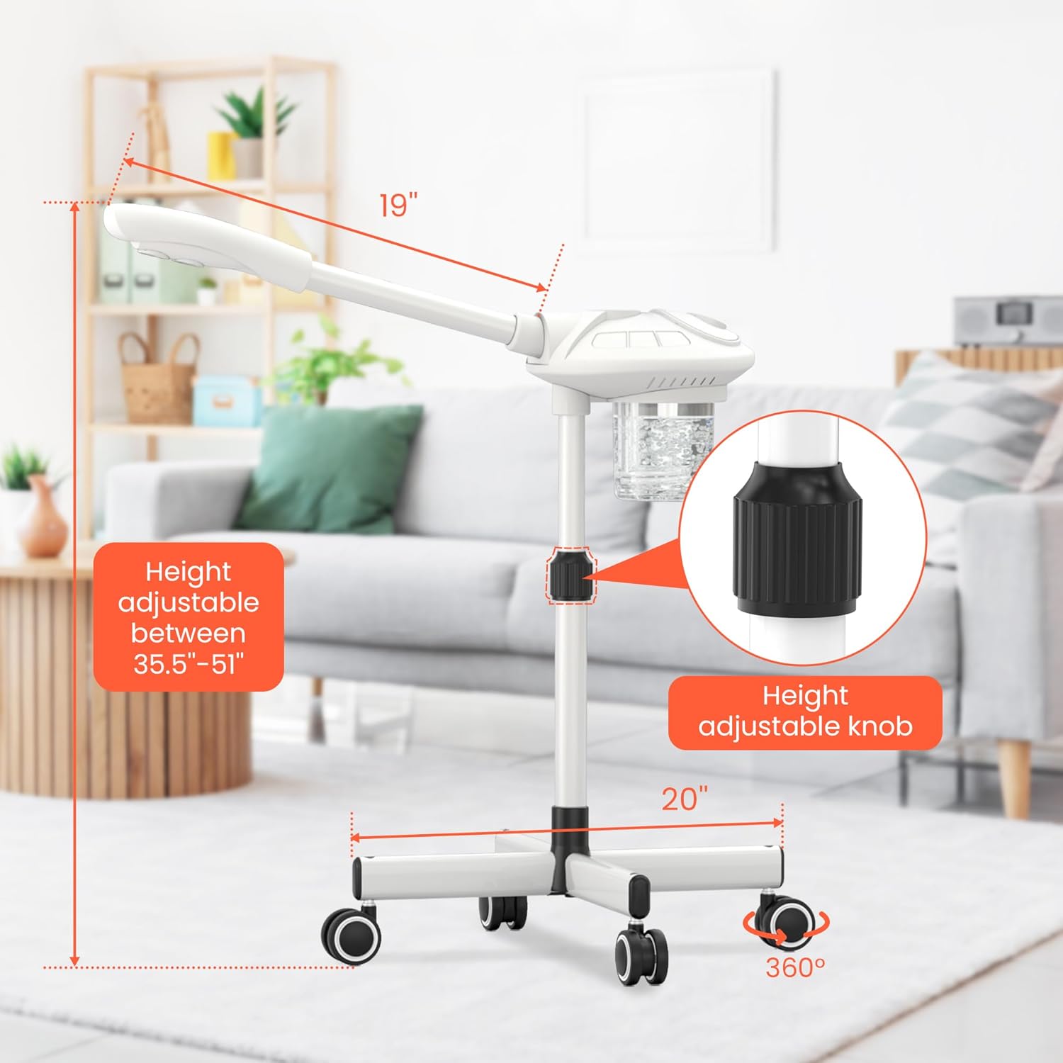 - Adjustable Height: The steamer's height can be adjusted as needed, and the nozzle can rotate to meet different angle requirements. Whether sitting or lying down, you can find the most comfortable angle for a comprehensive facial care experience and enjoy the steamer spa.