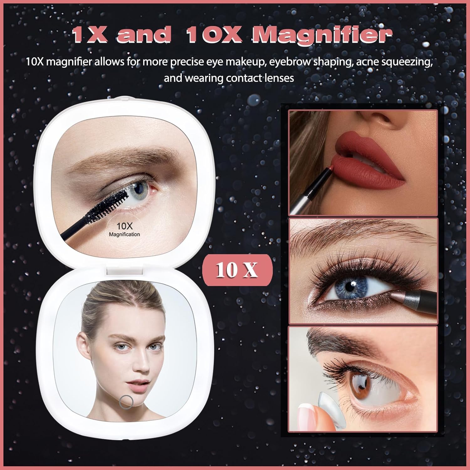 Portable LED Makeup Mirror - Compact Travel Mirror with Light, 10X Magnification, Adjustable Brightness, Rechargeable, for Her, Travel Accessories for Women, Ideal for Purse