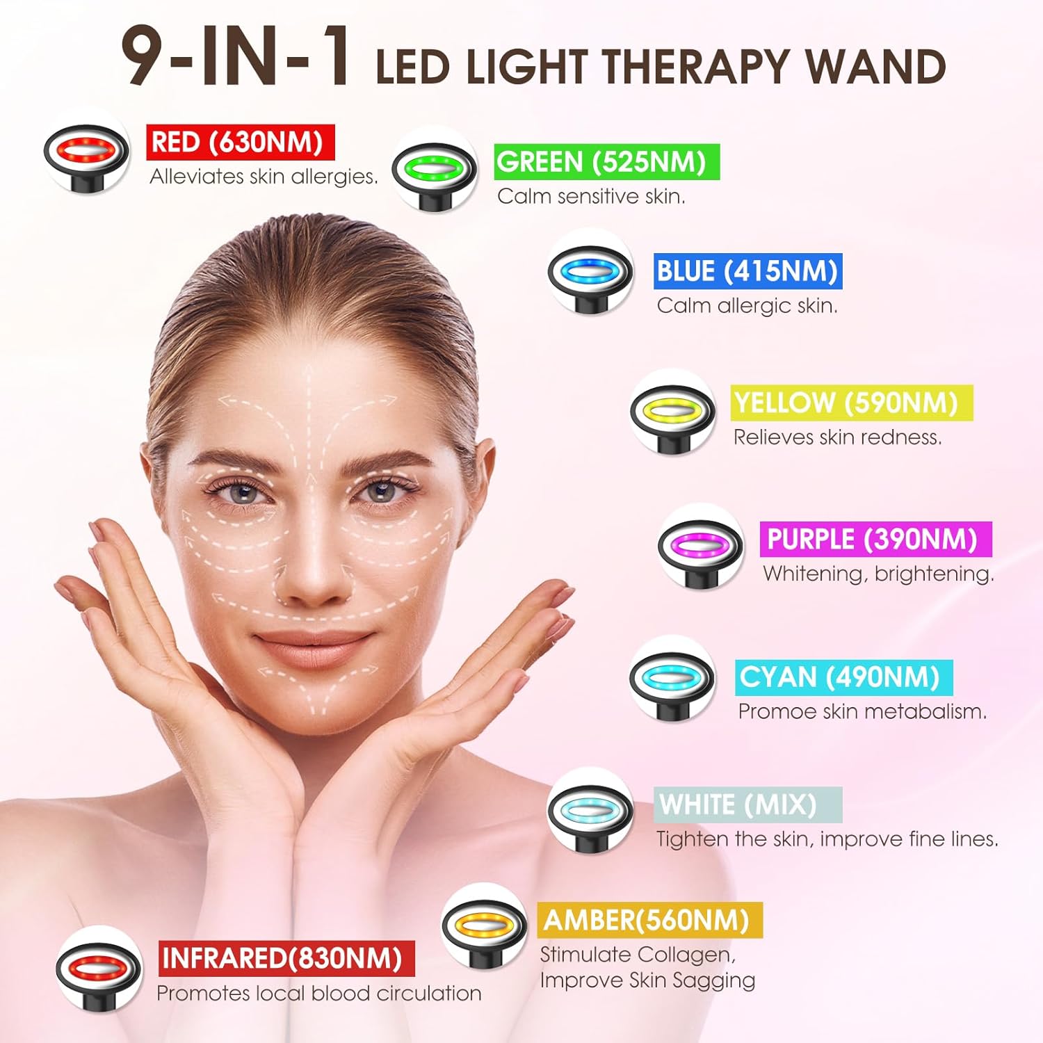 - 9-in-1 Led Facial Sculptor: The facial LED light therapy device offers various benefits through different wavelengths and colors of light. The addition of infrared light (830 nm) promotes local blood circulation, reduces localized redness, while amber light (560 nm) reduces wrinkles and replenishes collagen. Proper use of the nine-color light therapy device can help skin radiate brightness and vitality.