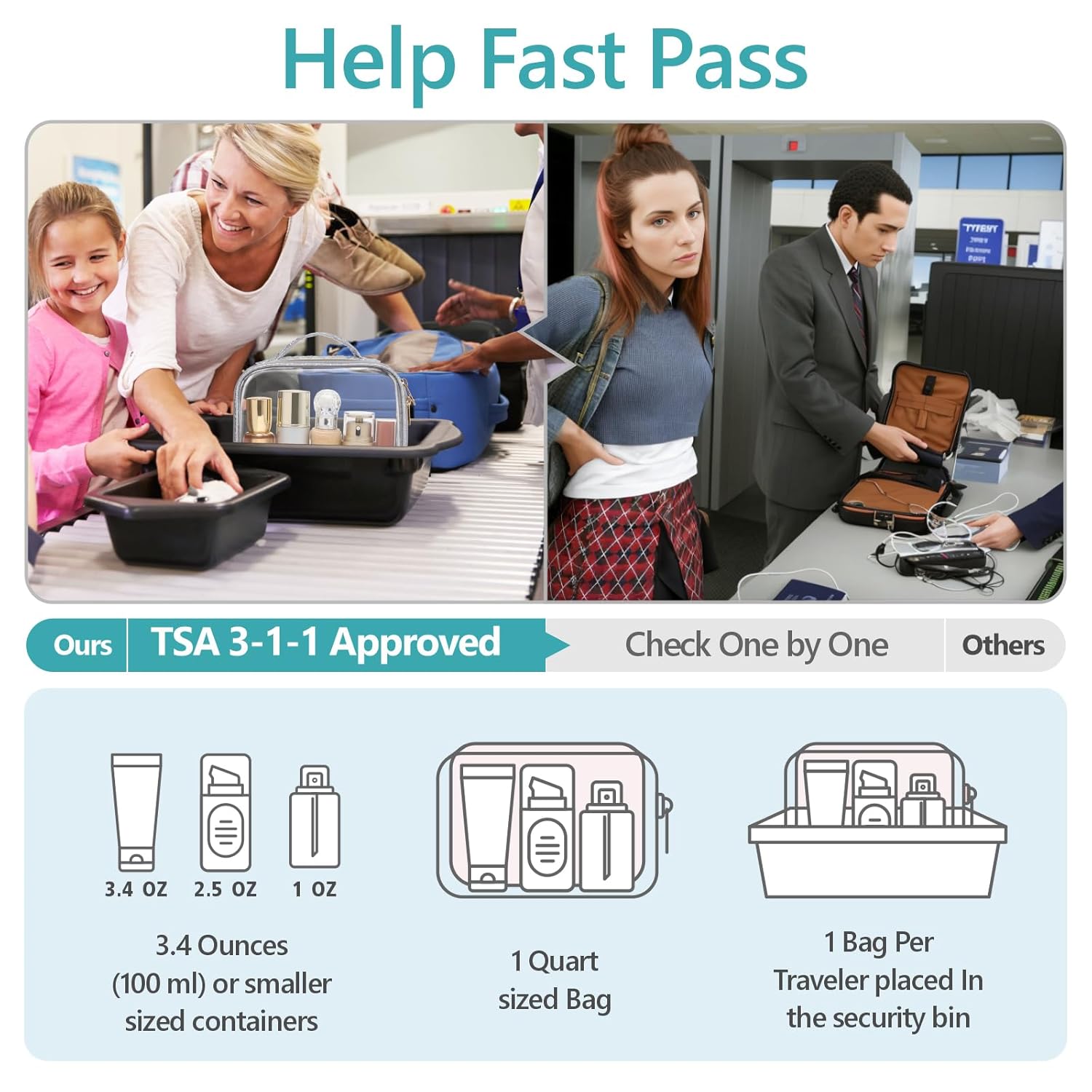 - TSA Approved: This medium size: 7.8 x 2.3 x 5.9 inch. Clear makeup bag follows the 3-1-1 Liquid Rule of airlines. When placing travel-sized containers that are 3.4 ounces or 100 milliliters in this quart-sized bag, you can quickly pass the airport security screening