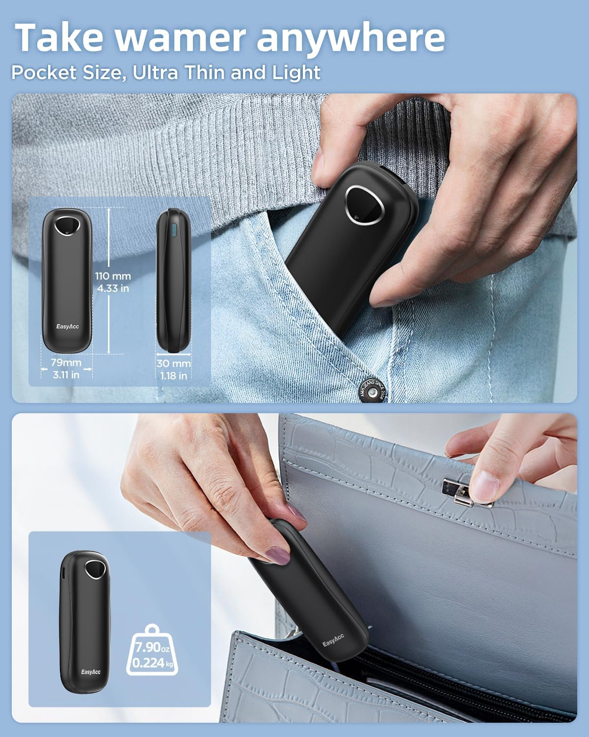 - 【The Palm-Friendly Design】: After 3 years of research, EasyAcc launched the most suitable hand warmers rechargeable for palm grip, perfect fit in the palm of your hand, Ergonomic design is comfortable to hold. The perfect winter companion for you and your Lovers!