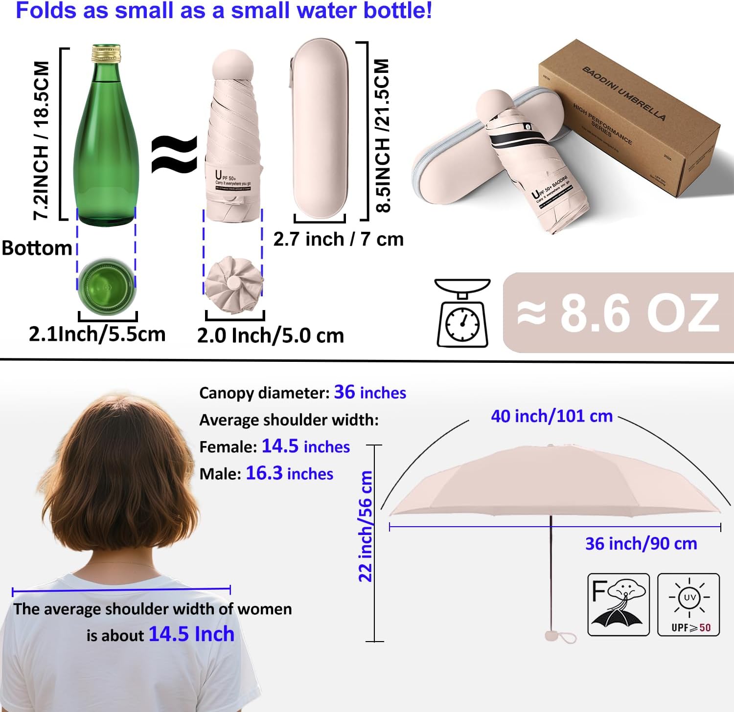 - Pocket umbrella: With a 40-inch arc and a 35.4-inch diameter, this mini travel umbrella is perfect for concealing in your purse or bag when youโre on the go! Folds to an ultra-compact 6.9 inches, makes the umbrella great for travel, as this super lightweight umbrella collapses about the size of your palm