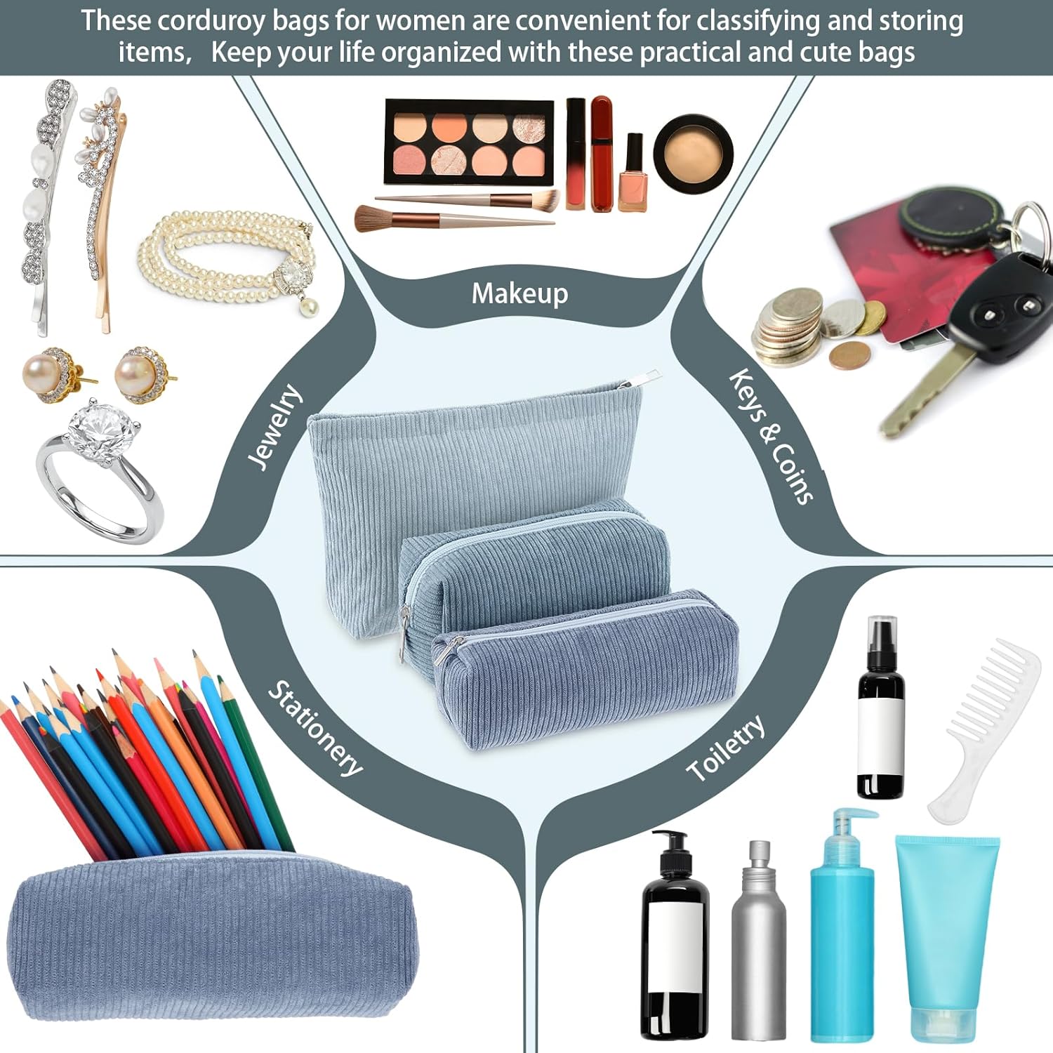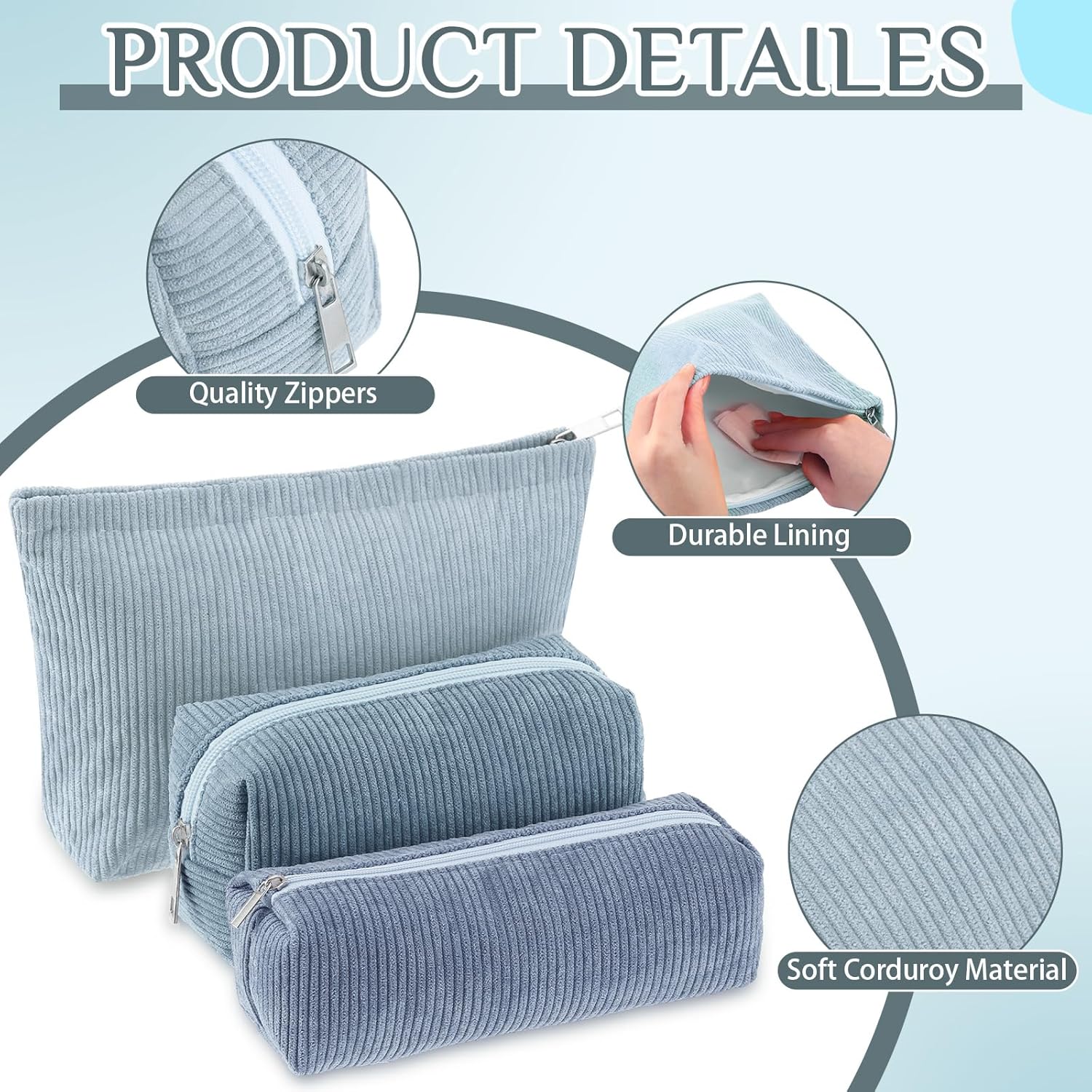 3 Pcs Makeup Bag Set for Women Corduroy Cosmetic Pouch Aesthetic Smile Travel Toiletry Bag Cute Purse Pouch Pencil Case Makeup Brushes Storage Organizer for Christmas(Blue,Gradient)