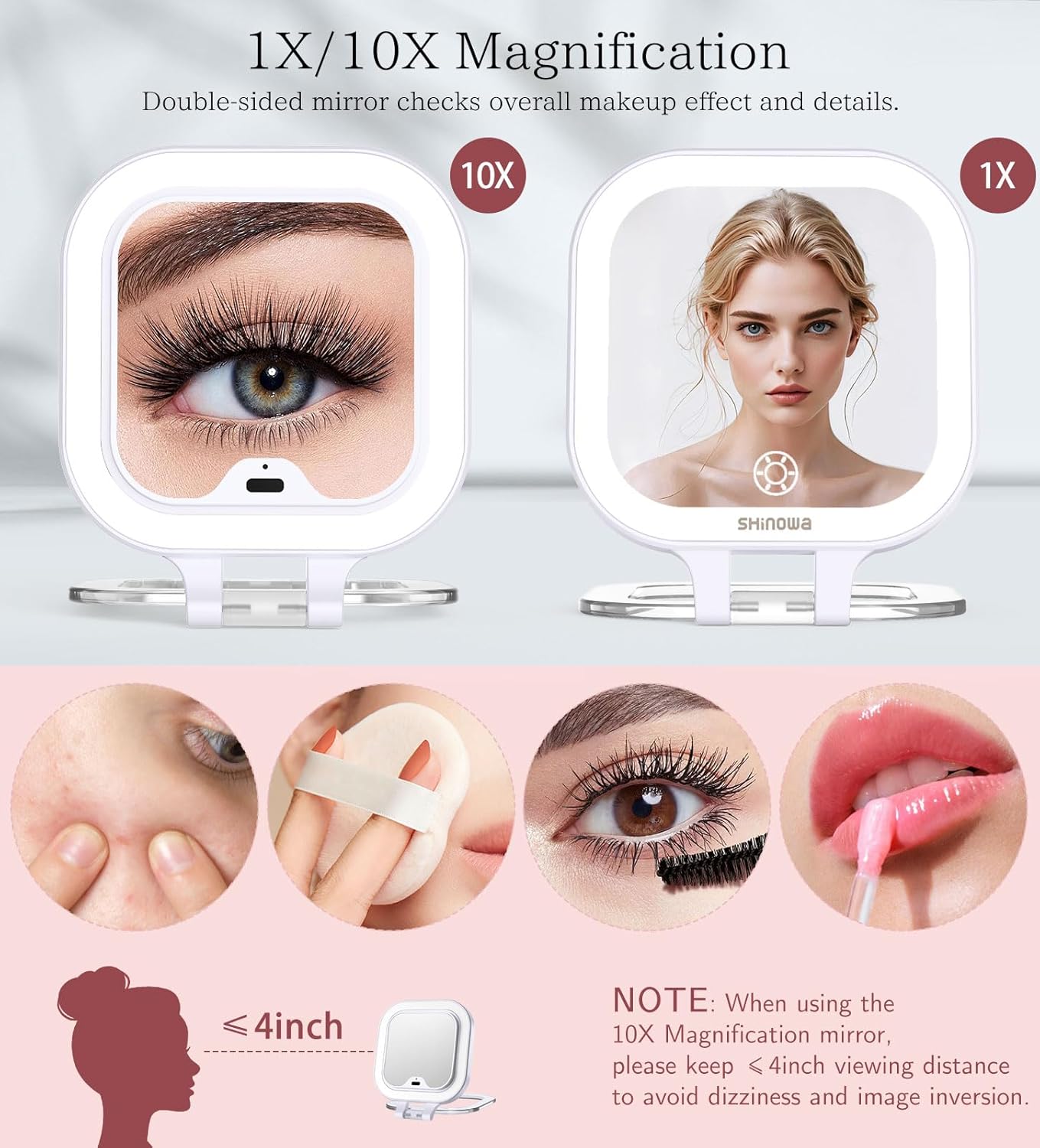 Shinowa Rechargeable Travel Makeup Mirror with 44 LED Lights, 1X/10X Magnifying Vanity Mirror with 3 Color Light, Folding Stand, 4 Inch Portable Dimmable Double Sided Compact Lighted Mirror, White