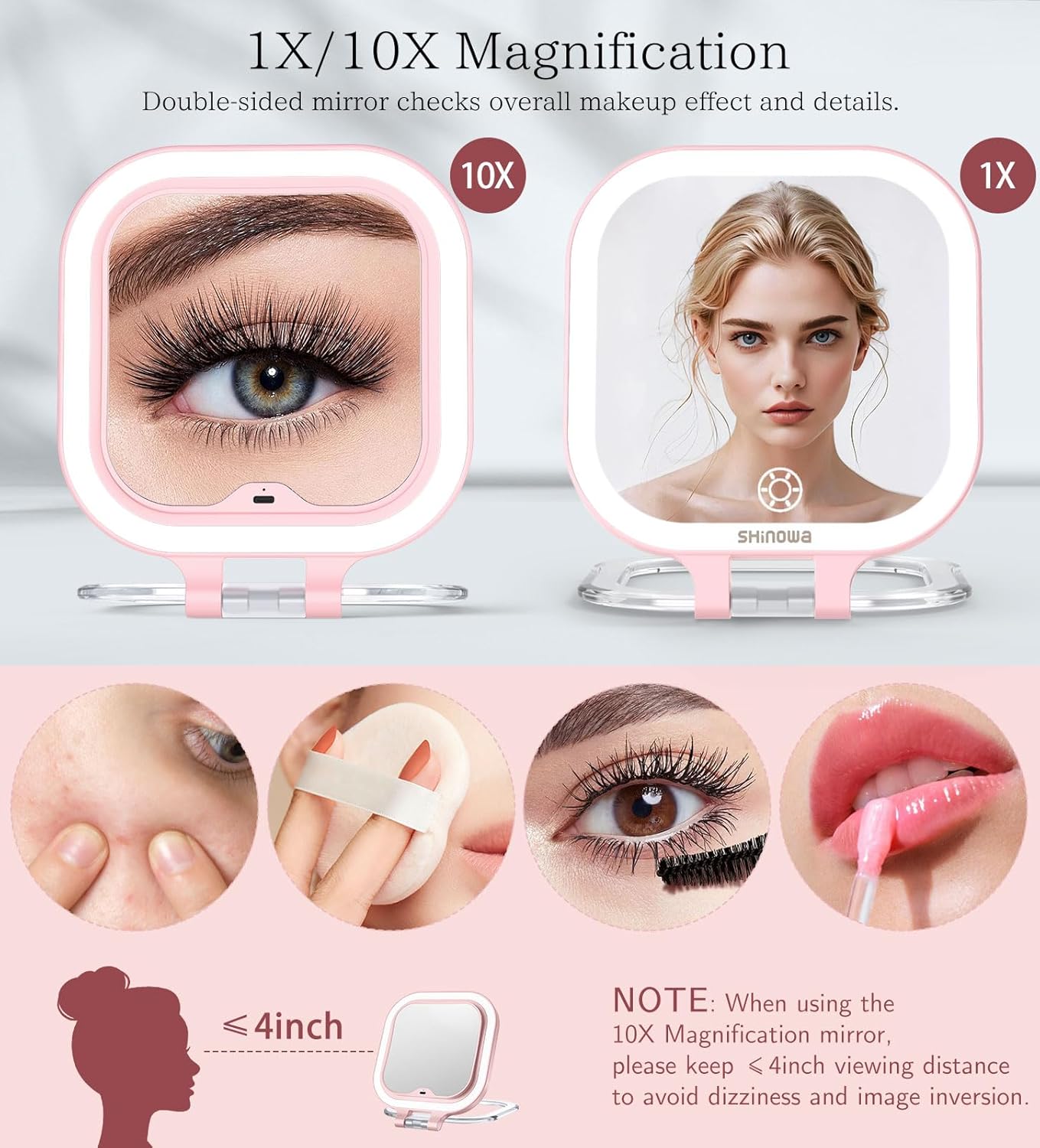 - 10X/1X Magnification Mirror: This travel makeup mirror features a double-sided design with 1X and 10X magnification. The 1X side is suitable for overall makeup and daily skincare. The 10X side zooms out your makeup details when applying eyeliner, mascara, or grooming eyebrows for a flawless and delicate makeup look. NOTE: When using the 10x magnifying mirror, please keep the mirror โค 4 inches or closer to your face.
