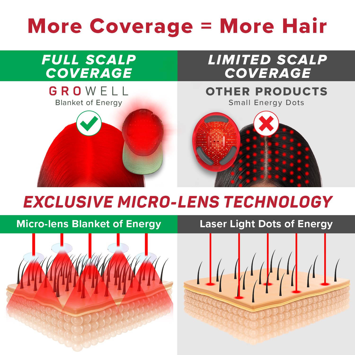 - Seamless scalp coverage: Delivers a blanket of energy, not just dots of light. Effective full scalp coverage for hair regrowth. Proprietary laser-LED design is the only technology to use precision micro lenses to shower laser light energy across the entire scalp - red light therapy for hair growth. No follicle left untreated.