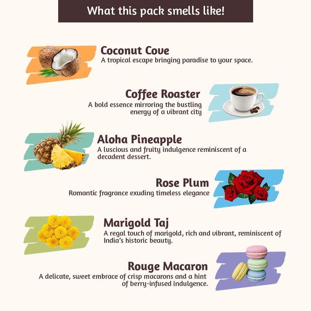 - FRAGRANCE NOTES β A refreshing blend of fragrances complemented by signature notes like Coconut Insense Sticks, Coffee incense, Rose inscents. Ideal for spiritual practices, they infuse any space with an uplifting, comforting aroma.
