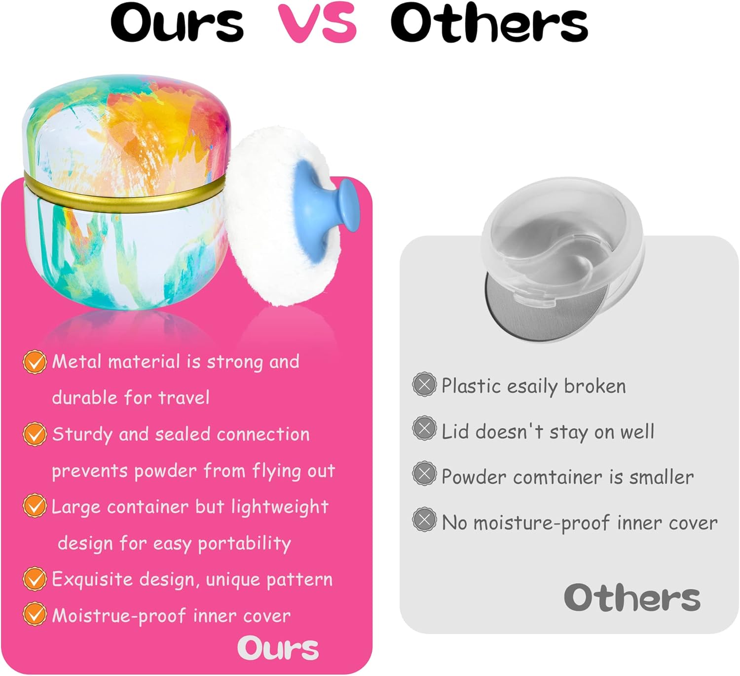 - The powder box has a delicate appearance and a variety of patterns for you to choose. The powder box is made of high-quality tinplate, which are not easy to break after being dropped, and not fade easily, and can be used for a long time. There is also a lid inside the powder box, so you don't have to worry about spilling powder.