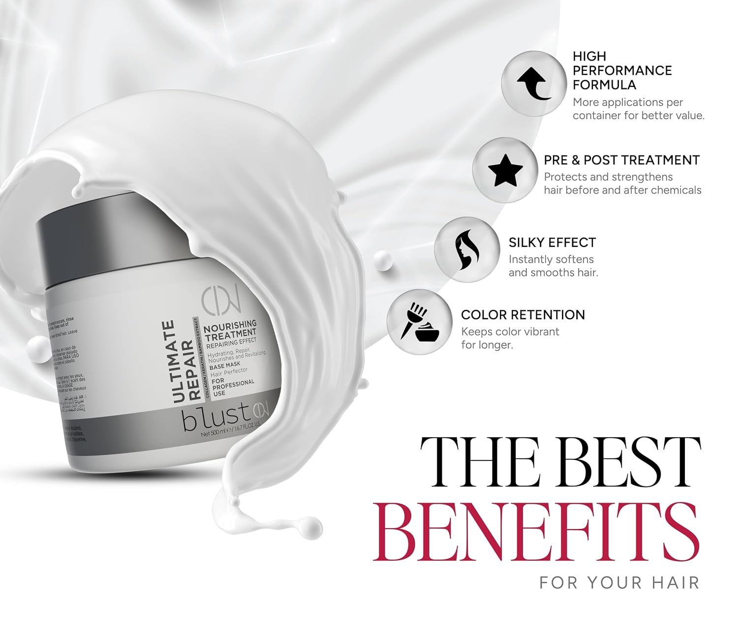 - Package Includes: One (1) 500 ml (16 oz) jar of Blust On Ultimate Repair Mask with an easy-to-store, water-resistant label, perfect for use in salons or at home.