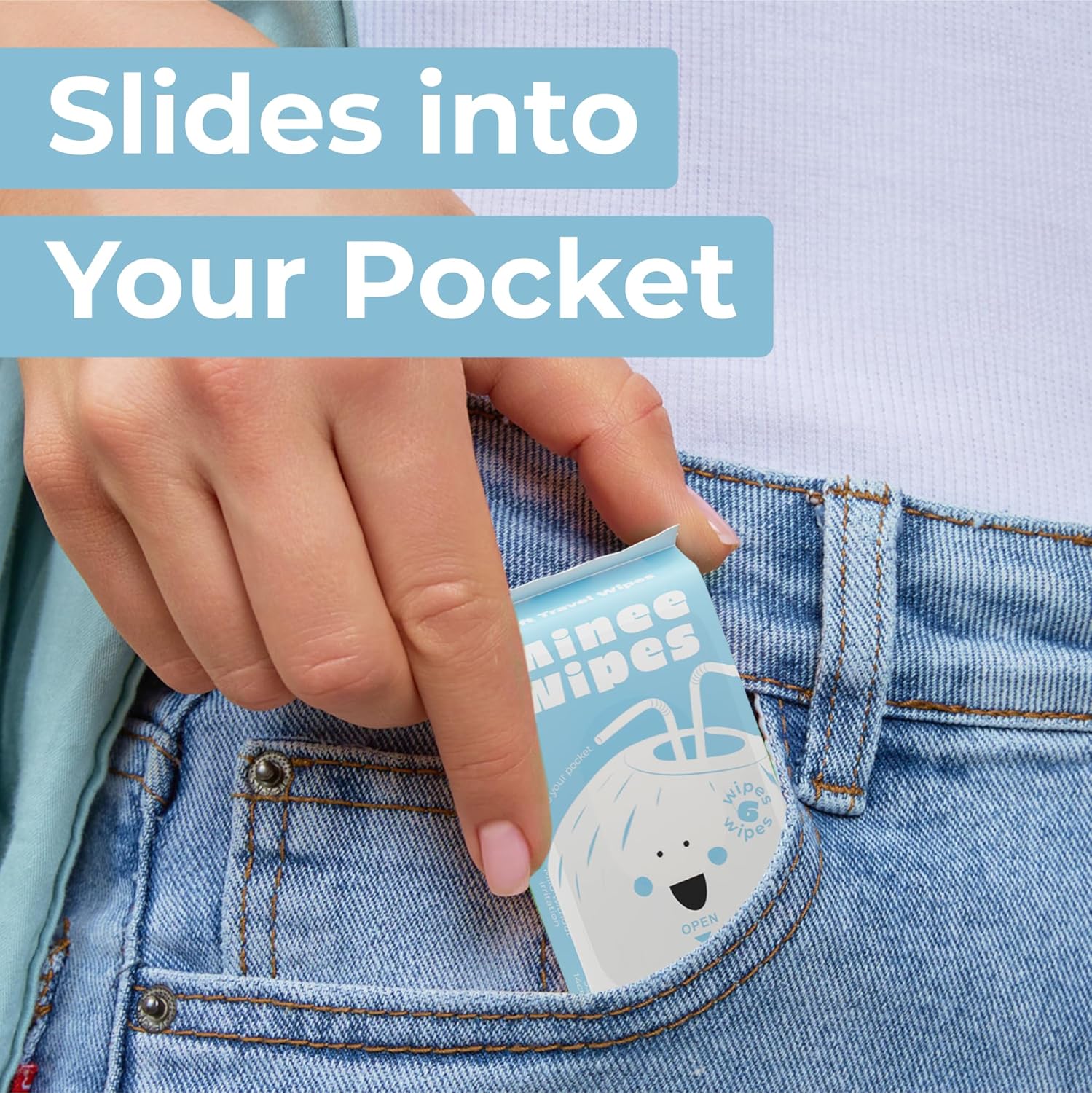 - đź’™COMPACT CREDIT CARD SIZE: Minee hand wipes are designed to be as compact as a credit card, making them perfect personal wipes for any occasion. Having 6 wipes in each small bag, these hand and face wipes are ideal wipes for adults and kids, offering a convenient hygiene solution that fits effortlessly into your wallet or purse.