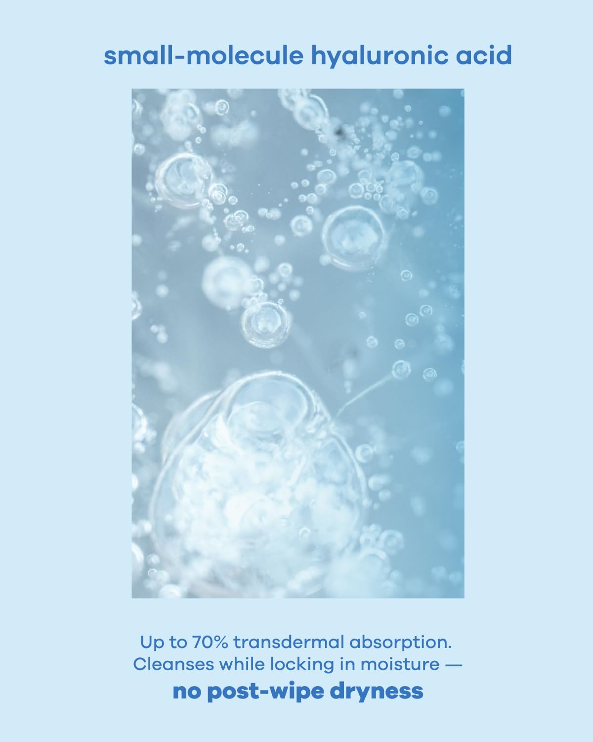 - Hydrating and Gentle:Infused with small-molecule hyaluronic acid that penetrates deeply, providing up to 70% transdermal absorption. Cleanses while locking in moisture โ no post-wipe dryness.