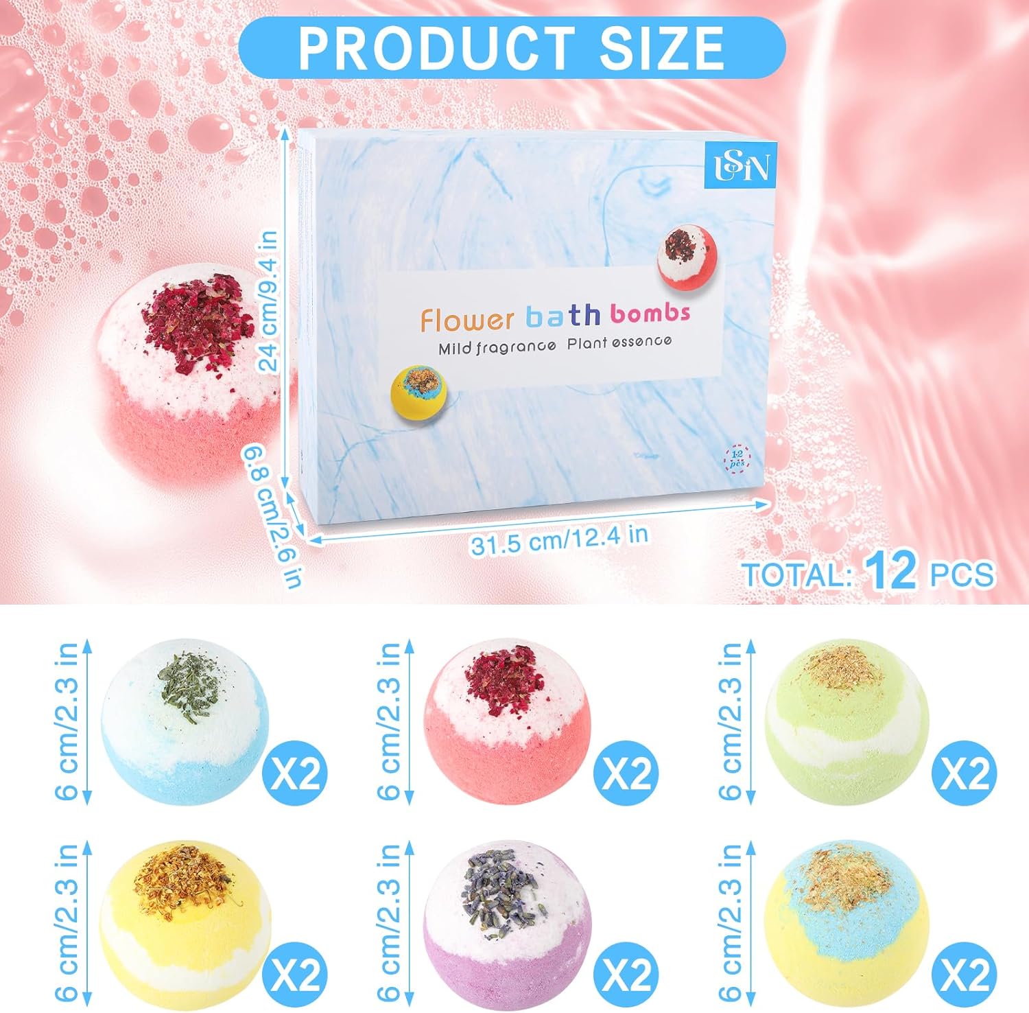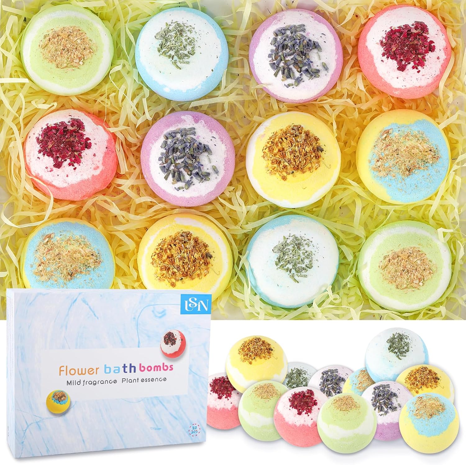 Bath Bombs for Women, USIN Natural Bubble Bath Balls Gift Set, Pack of 12 Pcs Multiple Bath Bomb, SPA Relaxing, Self Care, Gifts for Women, Men, Girls, Boys, Natural Flower Petals, 3.53 Oz Large Size