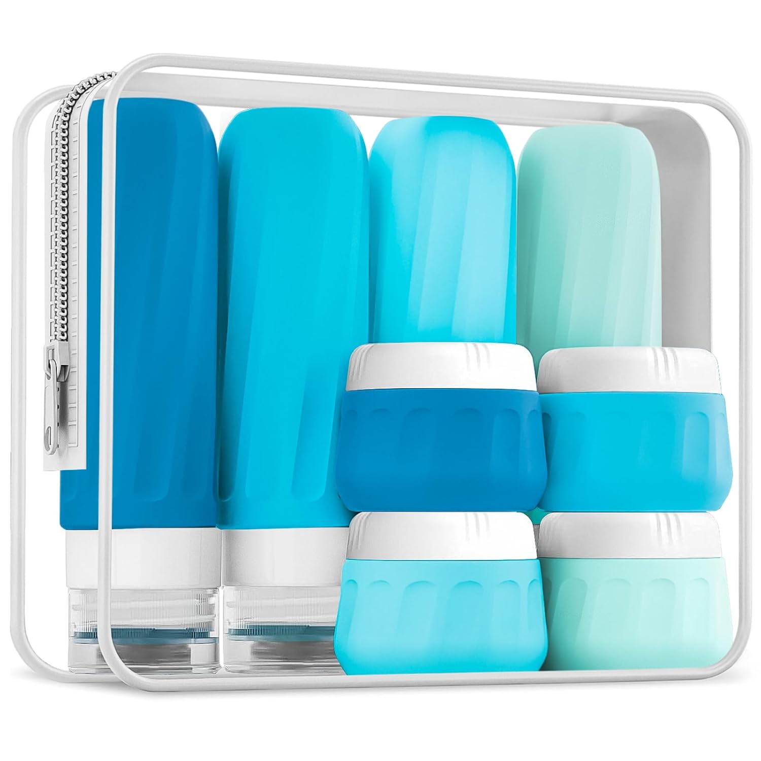 - Travel Size Toiletries: Set includes 4 silicone squeeze bottles 3oz(90ml) and 4 silicone cream jars 1oz(30ml) and clear make-up bag 6.46x2.87x5.31inch. Contents identification label sticker included