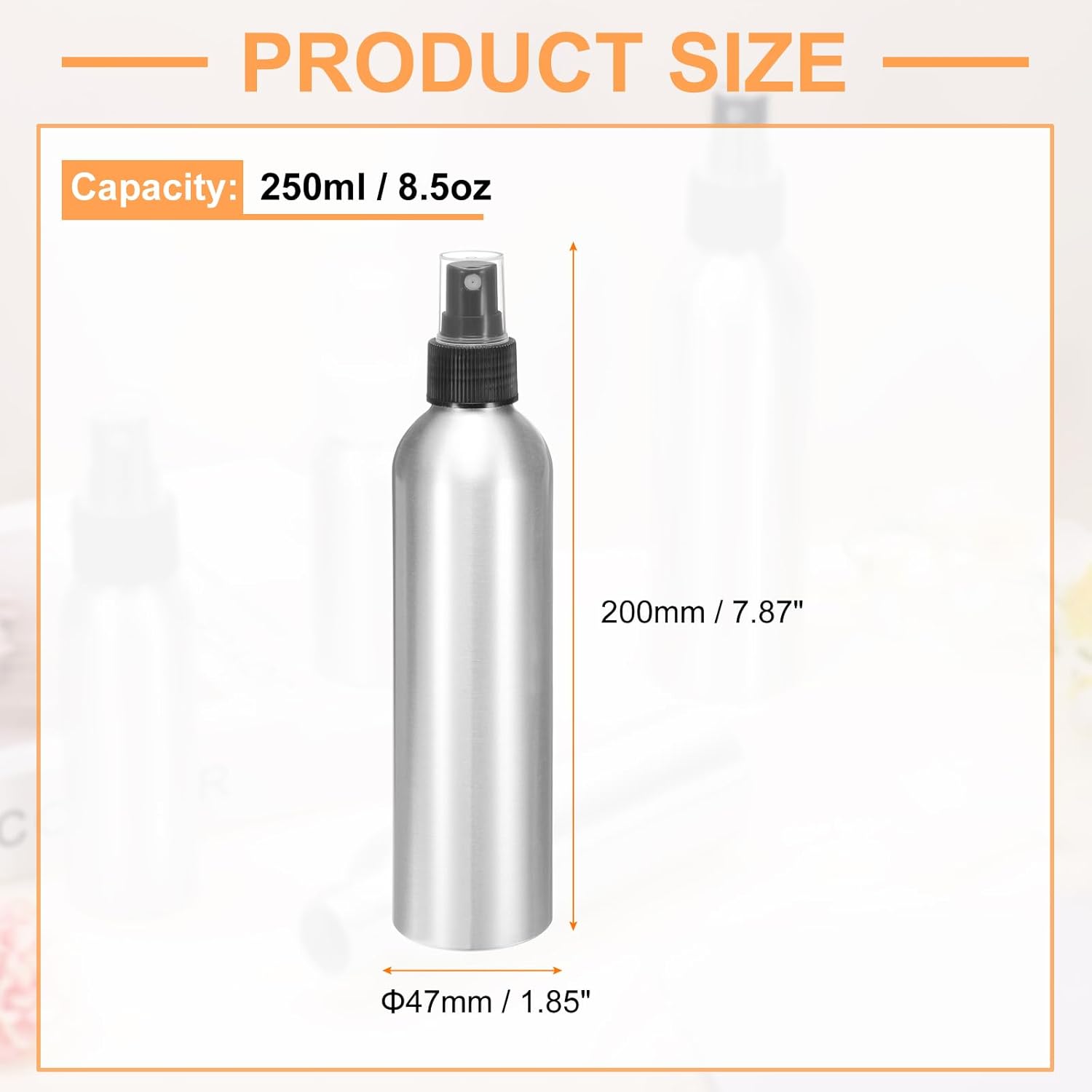 - Size - 250ml / 8.5oz capacity ; Total Size: 200 x 47mm / 7.87" x 1.85"(L*W). The nozzle design can spray a uniform and delicate atomized liquid, which can be used to store perfume, toner, lotion, spray or other liquids, etc.