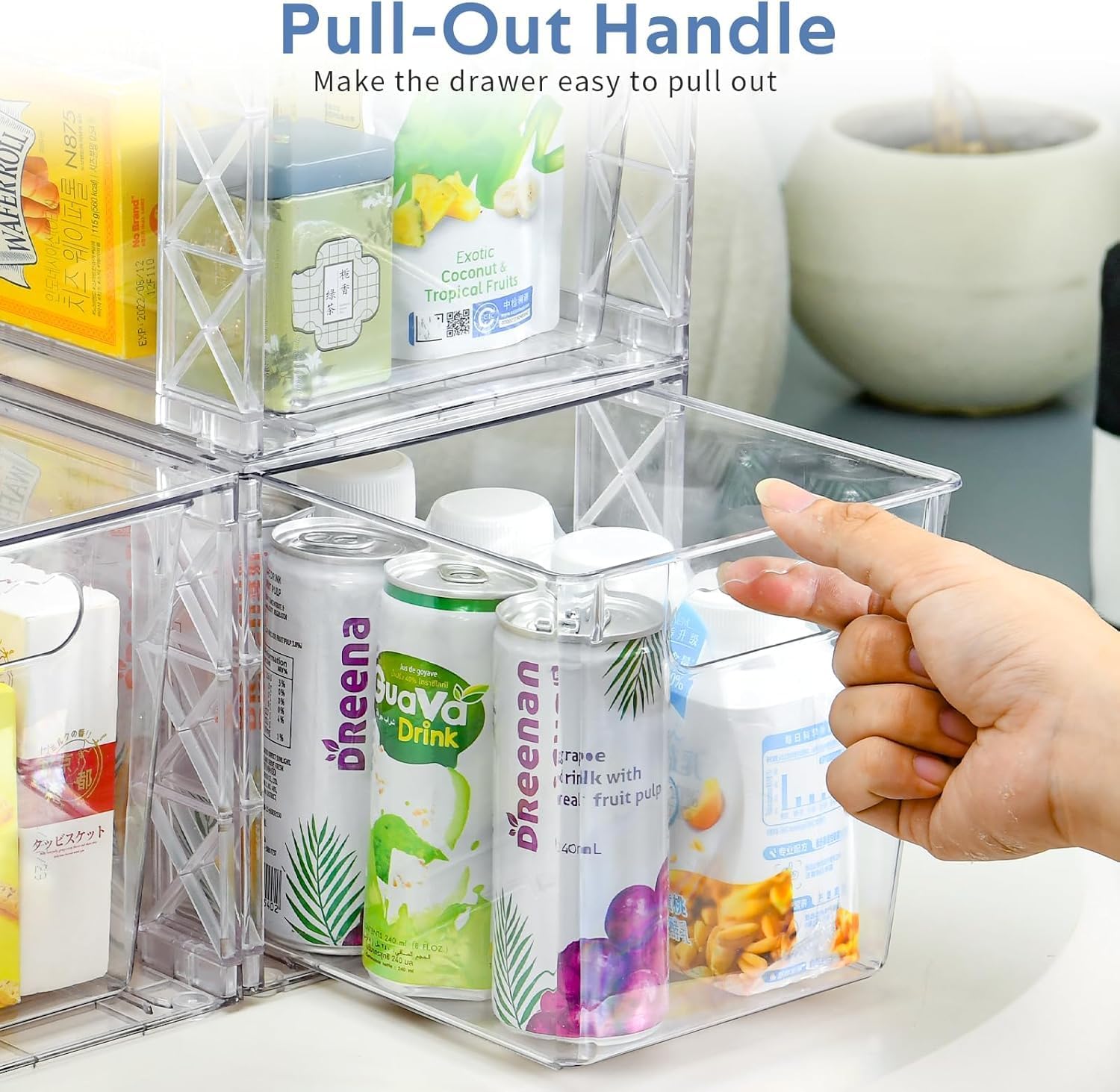 - MULTI-USE ORGANIZER - You can use these bins for various things throughout your home to organize and make your life easier. You can use these clear storage drawers for organizing snacks,drinks,facial maskscosmetics,makeup,medicine,baby bottles and other daily items in pantry,cabinets, bathroom closet,bathroom undersink,say goodbye to clutter in every room of your home