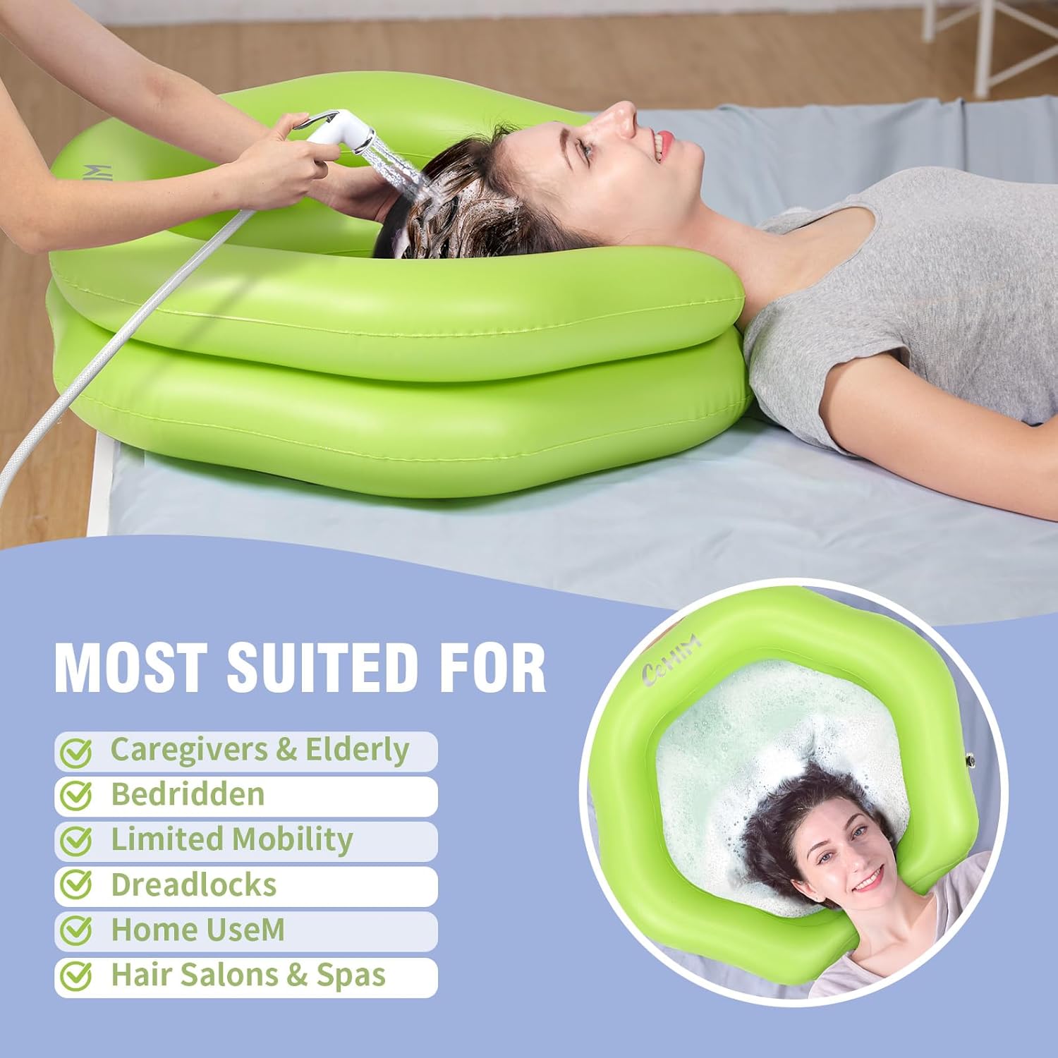 - 【Lightweight & Versatile Use】At just 1.1 lbs, this inflatable hair basin sets up in 3 minutes (blow up by mouth or pump). Use it on beds, couches, wheelchairs, or even camping trips—no need for a bathroom. The anti-slip base stays put, so you can focus on washing, not chasing spills.
