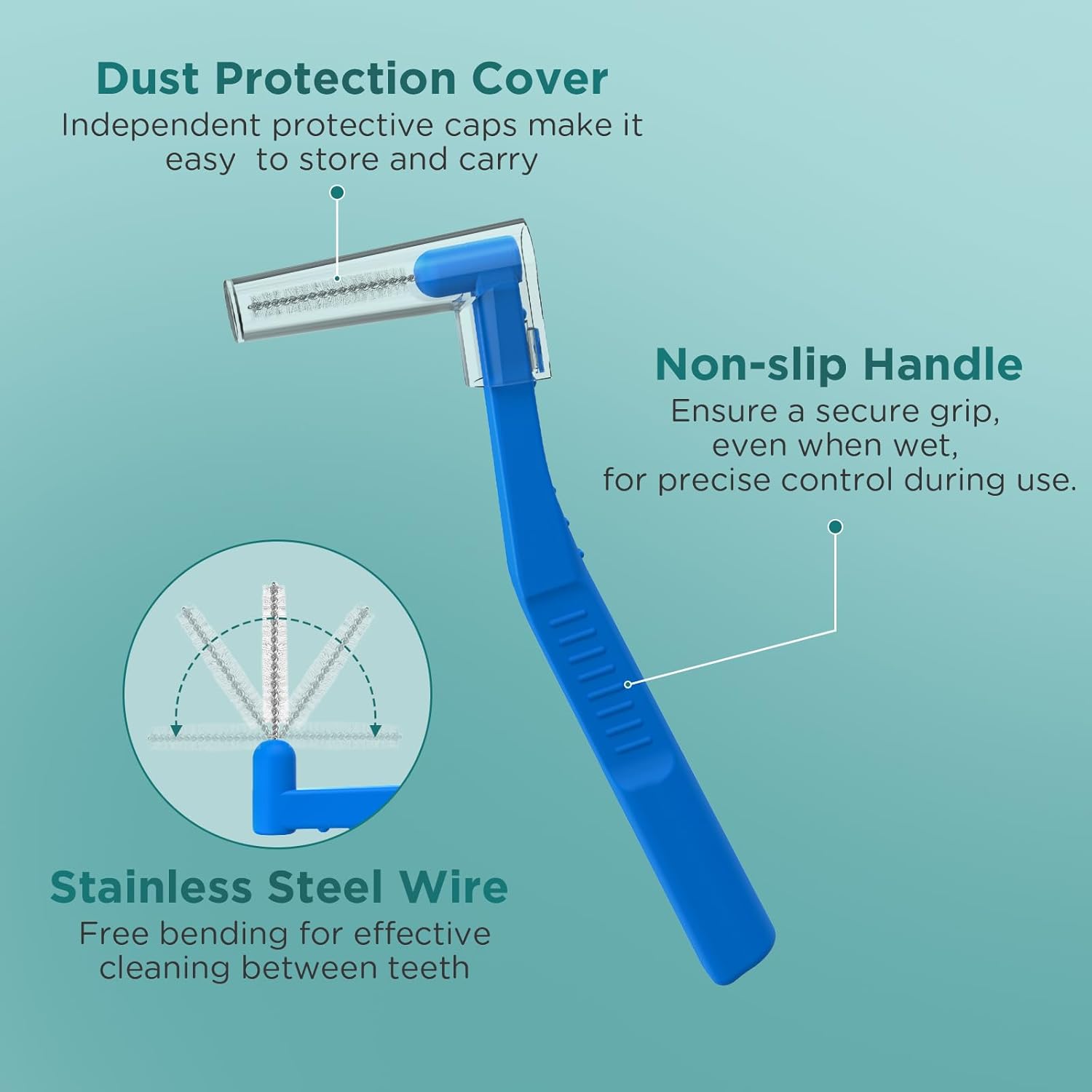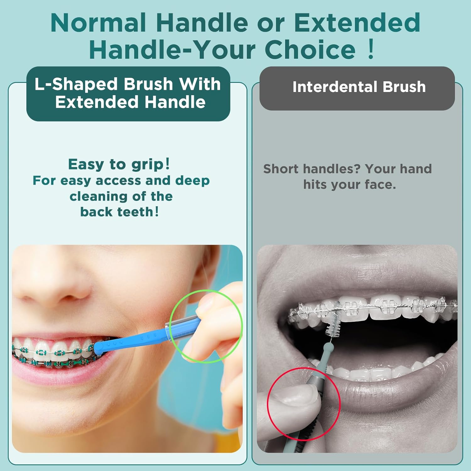 - ANGLE INTERDENTAL BRUSH WITH EXTENDED HANDLE: L-Shaped brush with extended handle facilitates deep cleaning teeth. A non-slip handle and angled neck make it easy to maneuver to the back of the mouth while proxy brush cleans around braces, bridges, implants. Normal handle or extended handle-your choice ๏ผ