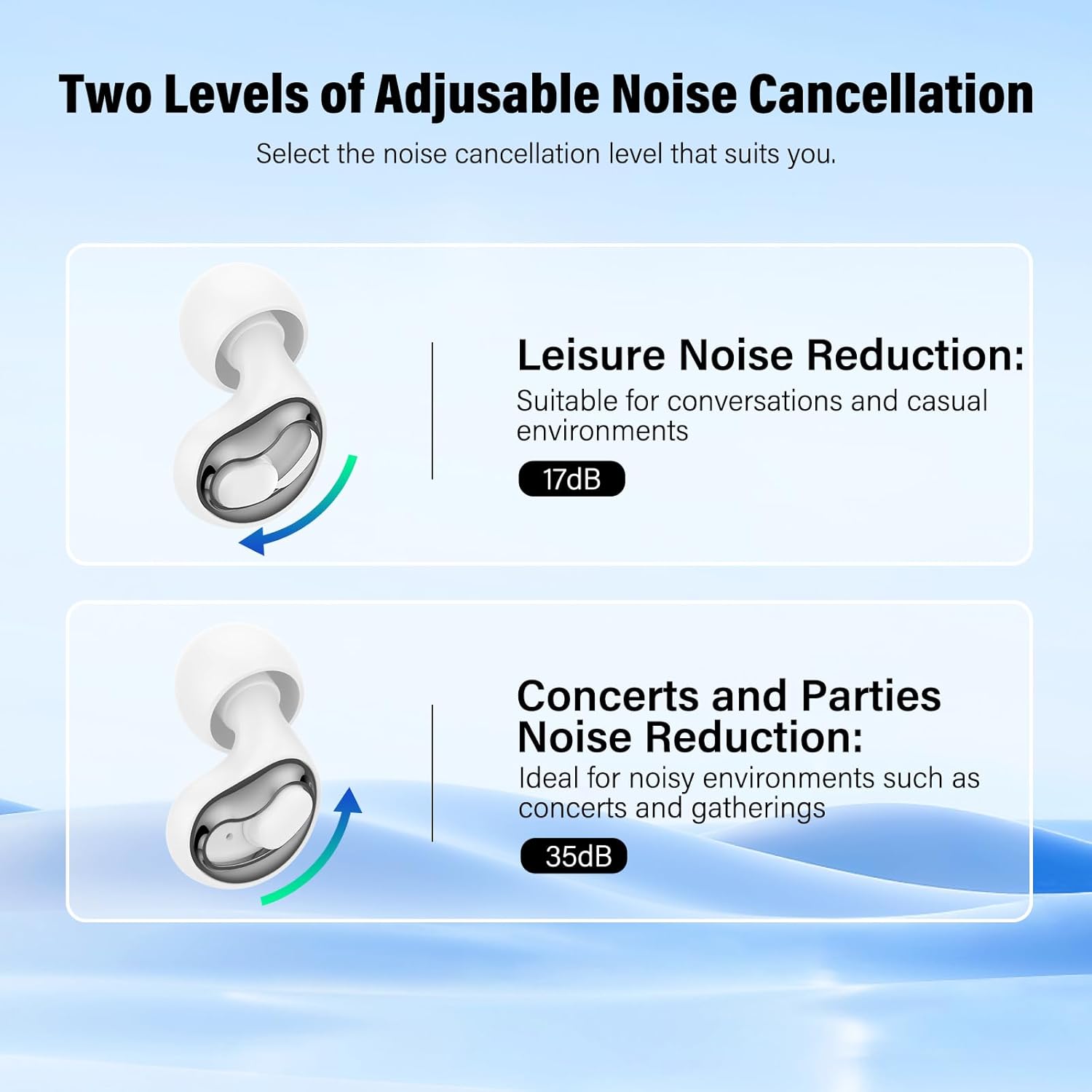 - Dual Noise Modes: S20 Pro Silicone earplugs Switch easily between two noise reduction levels (17dB & 35dB) to match your environment: use the lighter mode to stay focused at work or while reading, and activate the stronger mode for deep sleep, noisy commutes, or snore blocking at night. Tailored sound control without electronics or batteries.