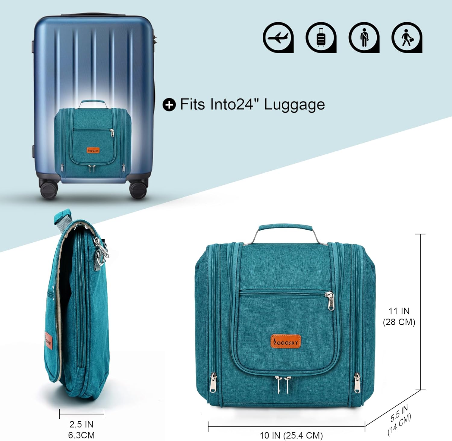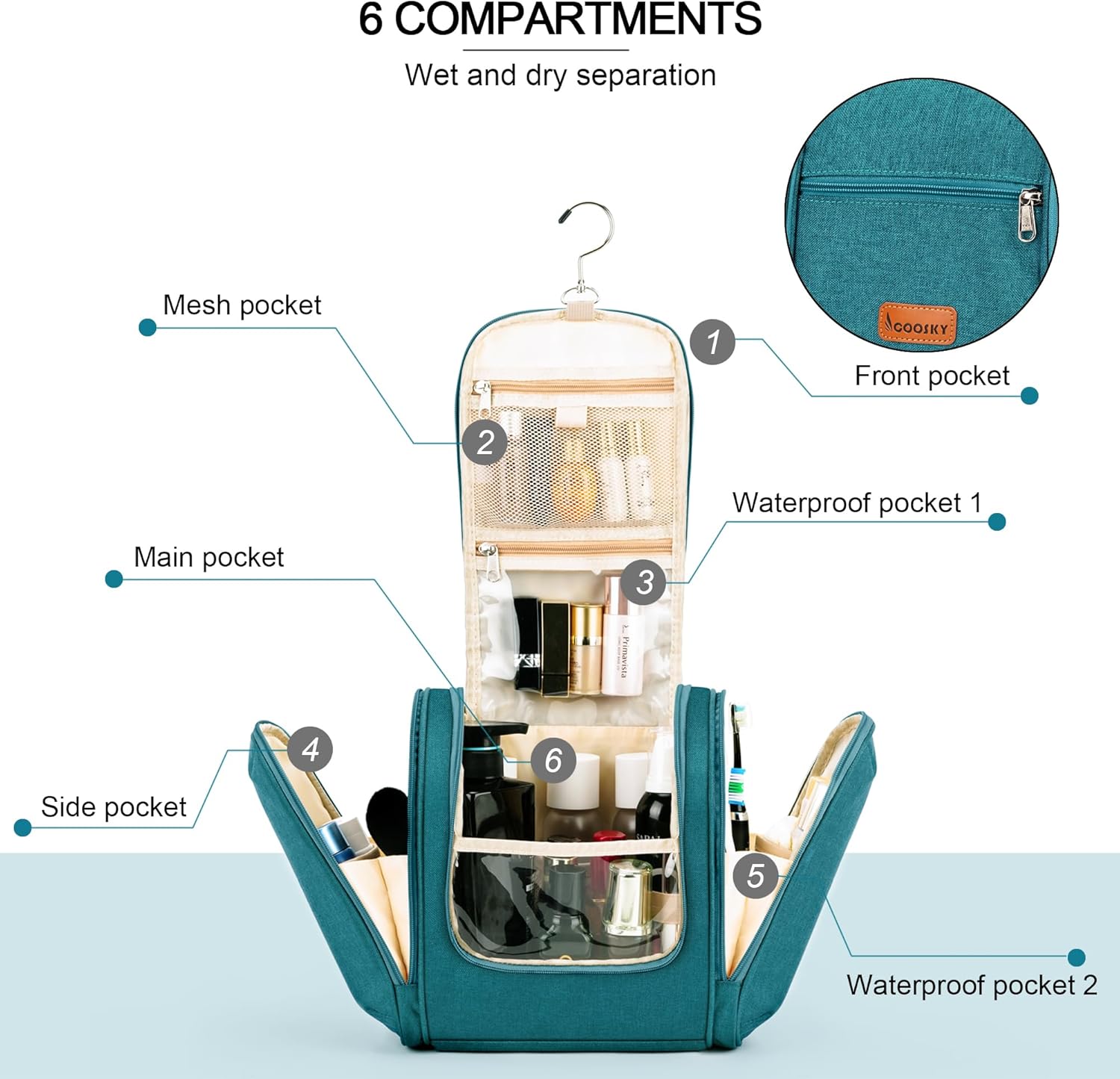 - CONSIDERABLE DESIGN - The elastic band and elastic mesh bag in the main compartment and two side compartments can keep the bottle fixed and upright. It has two waterproof compartments specially used for storing wet items. You can put your wet towel, toothbrush, shaving kit, and leaky cosmetics in it. The 360 degrees rotate metal hook gives you a variety of hanging options.