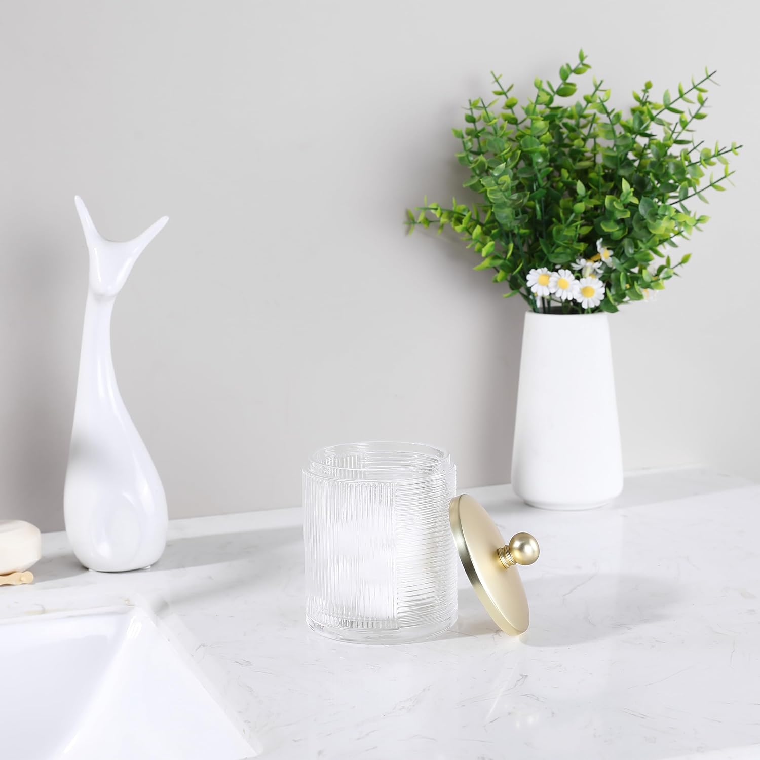 Glass Cotton Jar Holder Matte Gold Lid, Elegant Bathroom Storage Canister for Qtips, Cotton Balls, Floss, Makeup Organizer, Vanity Bathroom Organization