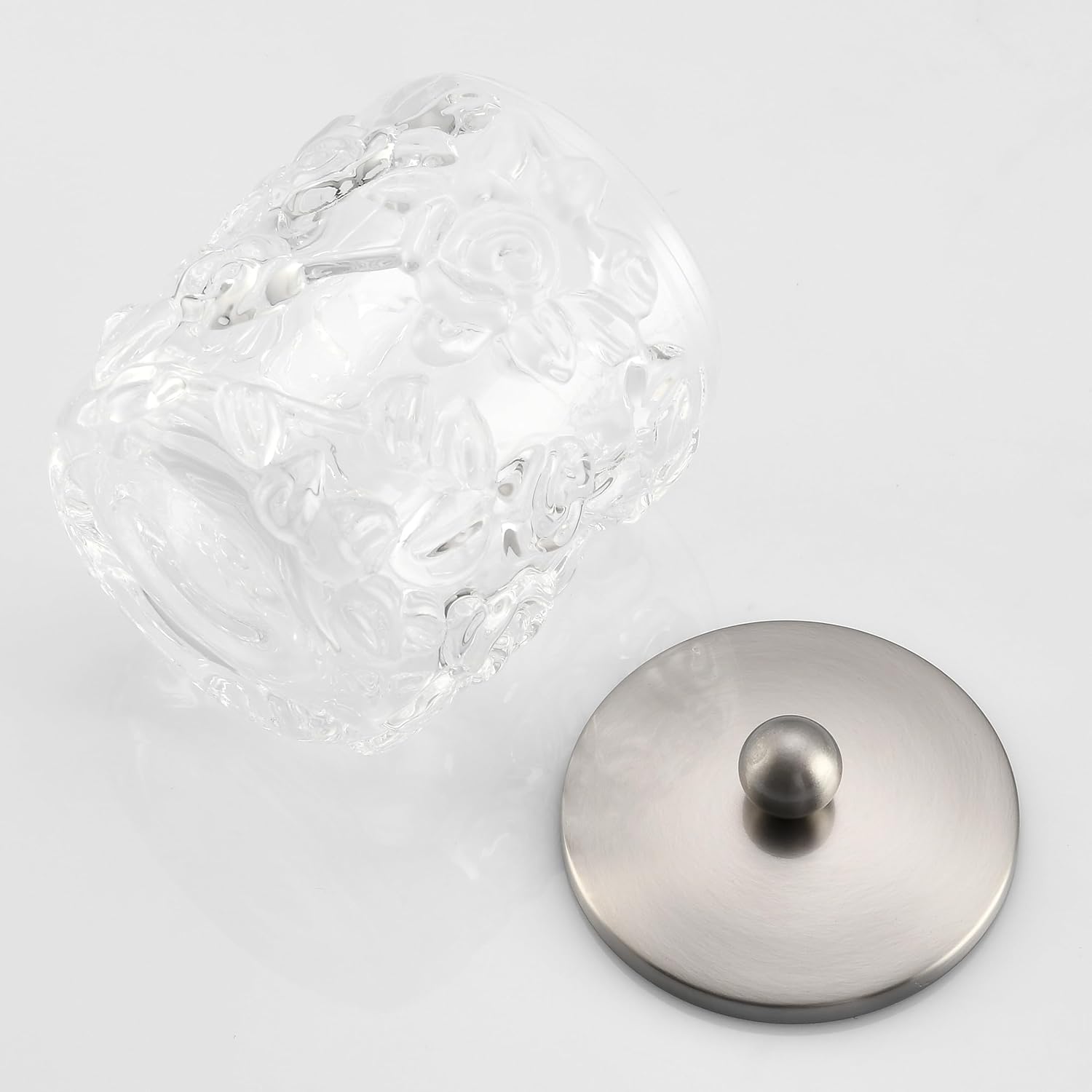Home Glass Cotton Jar Holder Nickel Lid, Elegant Bathroom Storage Canister for Qtips, Cotton Balls, Floss, Makeup Organizer, Vanity Bathroom Organization (UPDATED NICKEL)