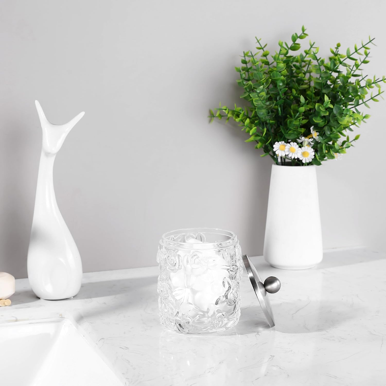 - Ideal for storing Qtips, cotton balls, floss, and makeup essentials