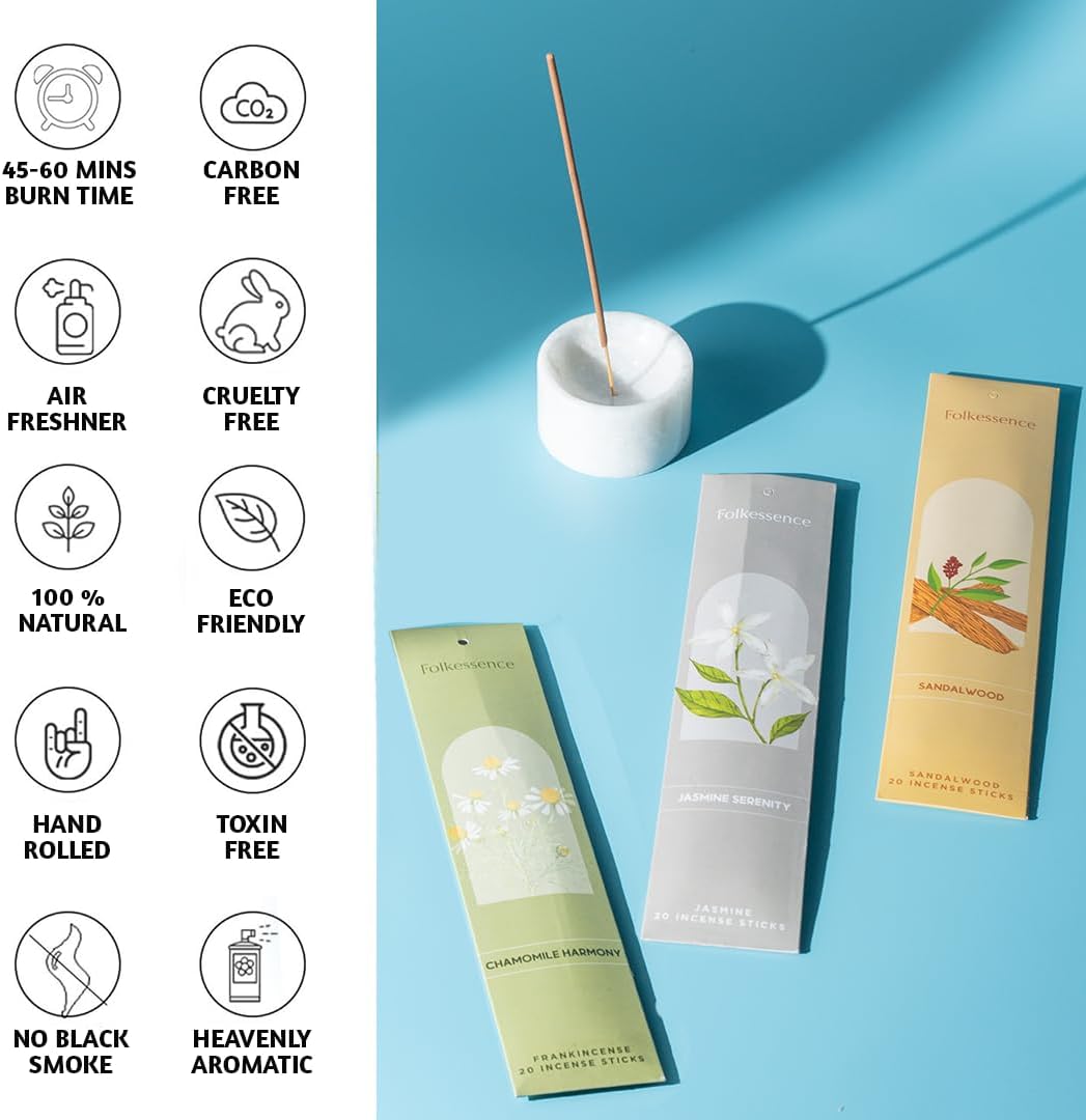 - FRAGRANCE NOTES β A refreshing blend of fragrances complemented by signature notes like Jasmine insense, Chamomile inscent, Sandalwood Incense, Rose inscents, Lavender incense. Ideal for spiritual practices, they infuse any space with an uplifting, comforting aroma.