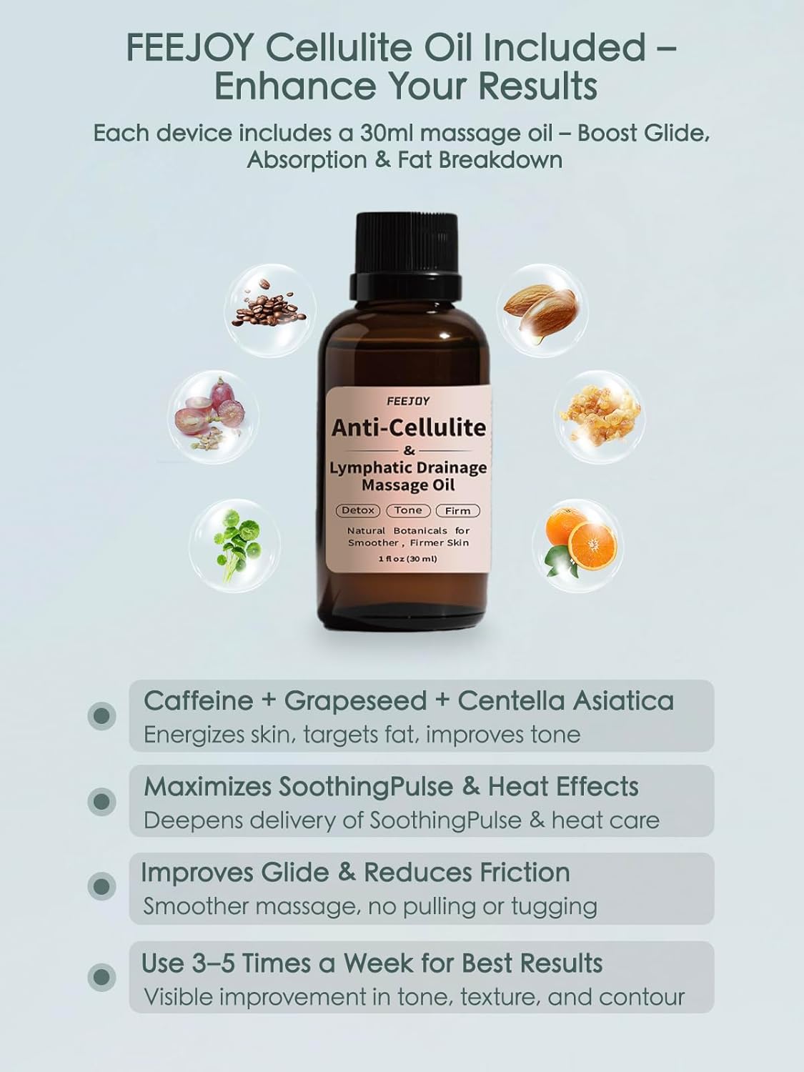 - Boost Results with FEEJOY Cellulite Oil – Recommended Pairing: Includes FEEJOY Anti-Cellulite & Lymphatic Drainage Massage Oil infused with caffeine, grape seed, and centella. Pairing with the oil enhances glide, absorption, and fat-targeting results. Use 3–5 times a week for visible improvement in tone, texture, and body shape.