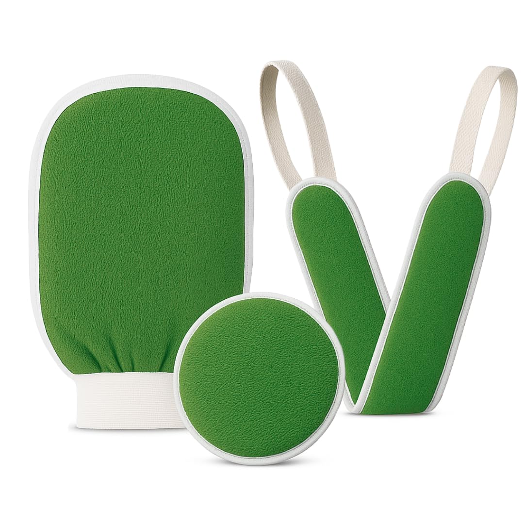 Exfoliating Glove Set (Original) – 3 Pieces Moroccan Hammam Scrub Mitts for Face, Body & Back – Deep Skin Cleansing & Dead Skin Removal – Reusable Spa Exfoliator – Assorted Colors (GREEN)