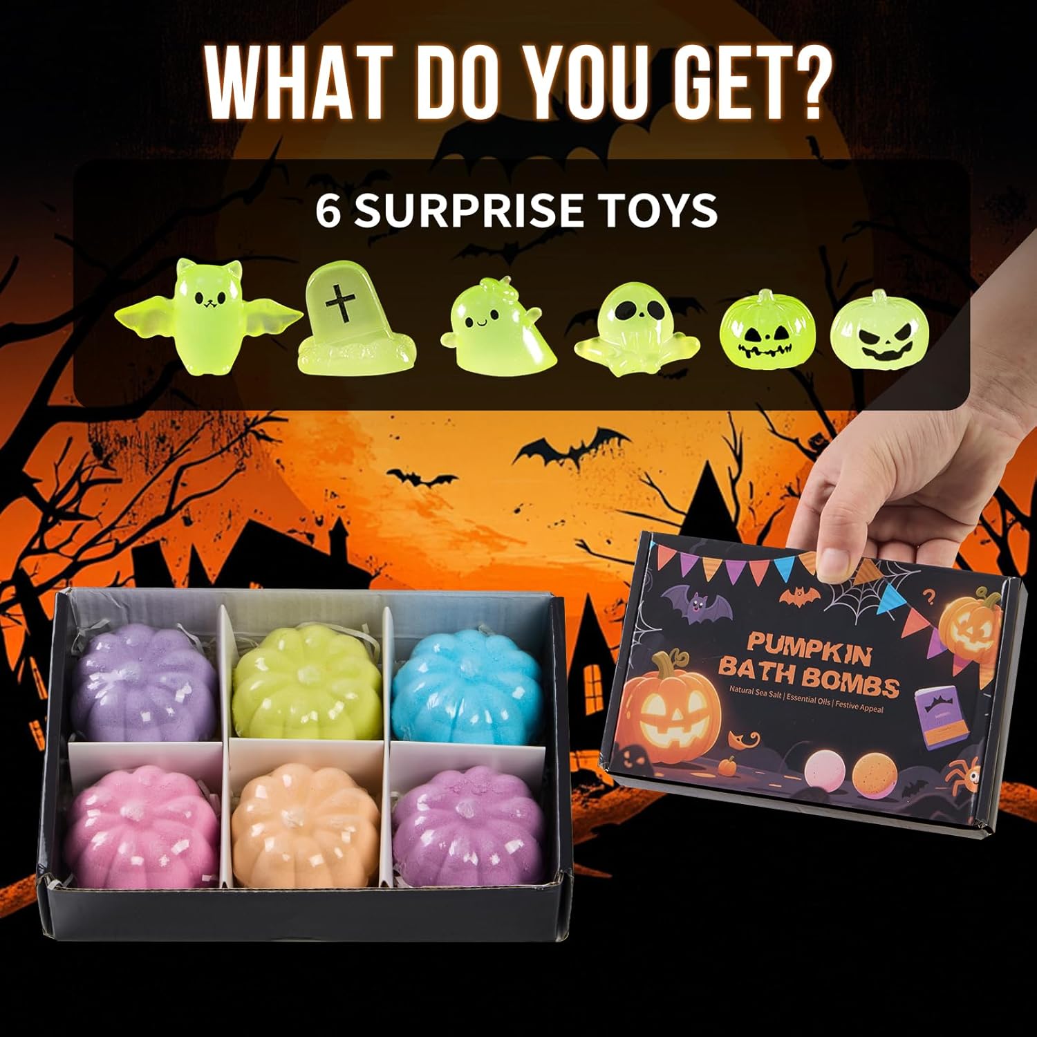 Halloween Bath Bombs for Kids Pumpkin Bath Bombs with Halloween Luminous Mini Resin Toys Inside Halloween Toys Halloween Treat Bags Gifts Kids Skin Care Bathbombs