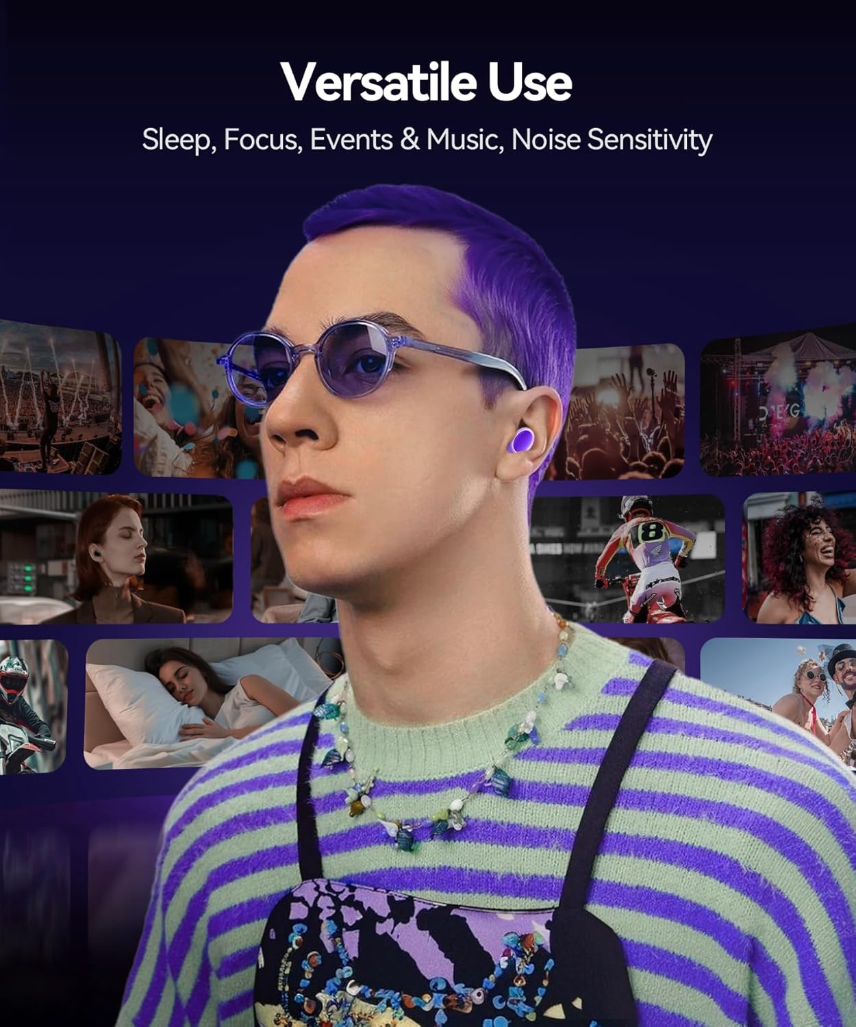 - 45dB Superior Noise Reduction: Ear plugs use advanced acoustic filters to block disruptive noise (as snoring or talk) for deep sleep, while maintaining clear sound during concerts or holiday events by reducing noise without distortion. Ear plugs for sleeping feature a multi-layer sound insulation design,combining high-density and sound insulation technology to provide 45dB hearing protection, ensuring safety without affecting sound quality. Earplugs are perfect for side sleepers & concert fans