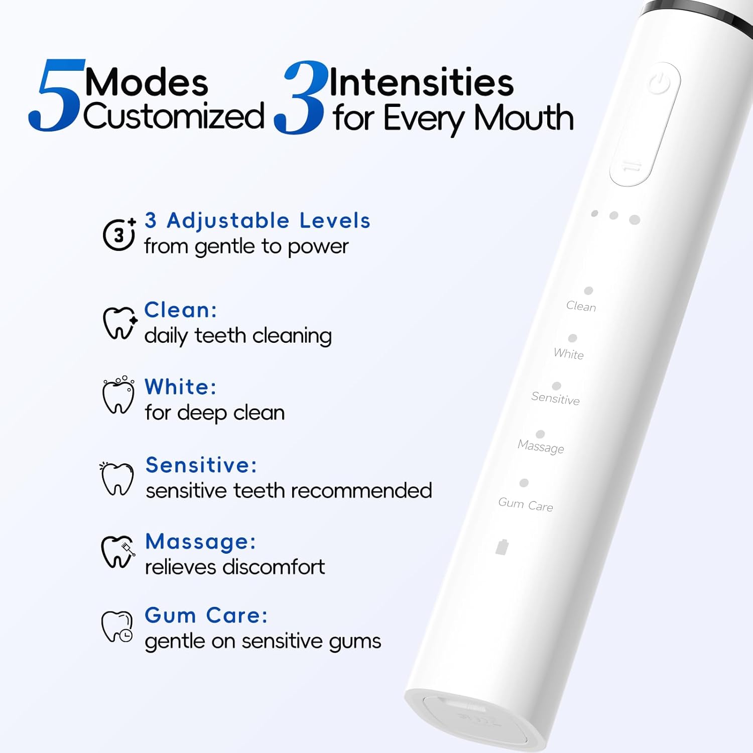 - Personalized Cleaning:SEIGA electric toothbrush for adults offers 5 modes—Clean,White,Sensitive,Massage,and Gum Care—plus 3 intensity levels to match different oral needs.Smart memory remembers your last setting,making it easy to use every time.Whether you're looking for a toothbrush electric rechargeable or sonicare toothbrush for adults,this one adapts to your lifestyle.