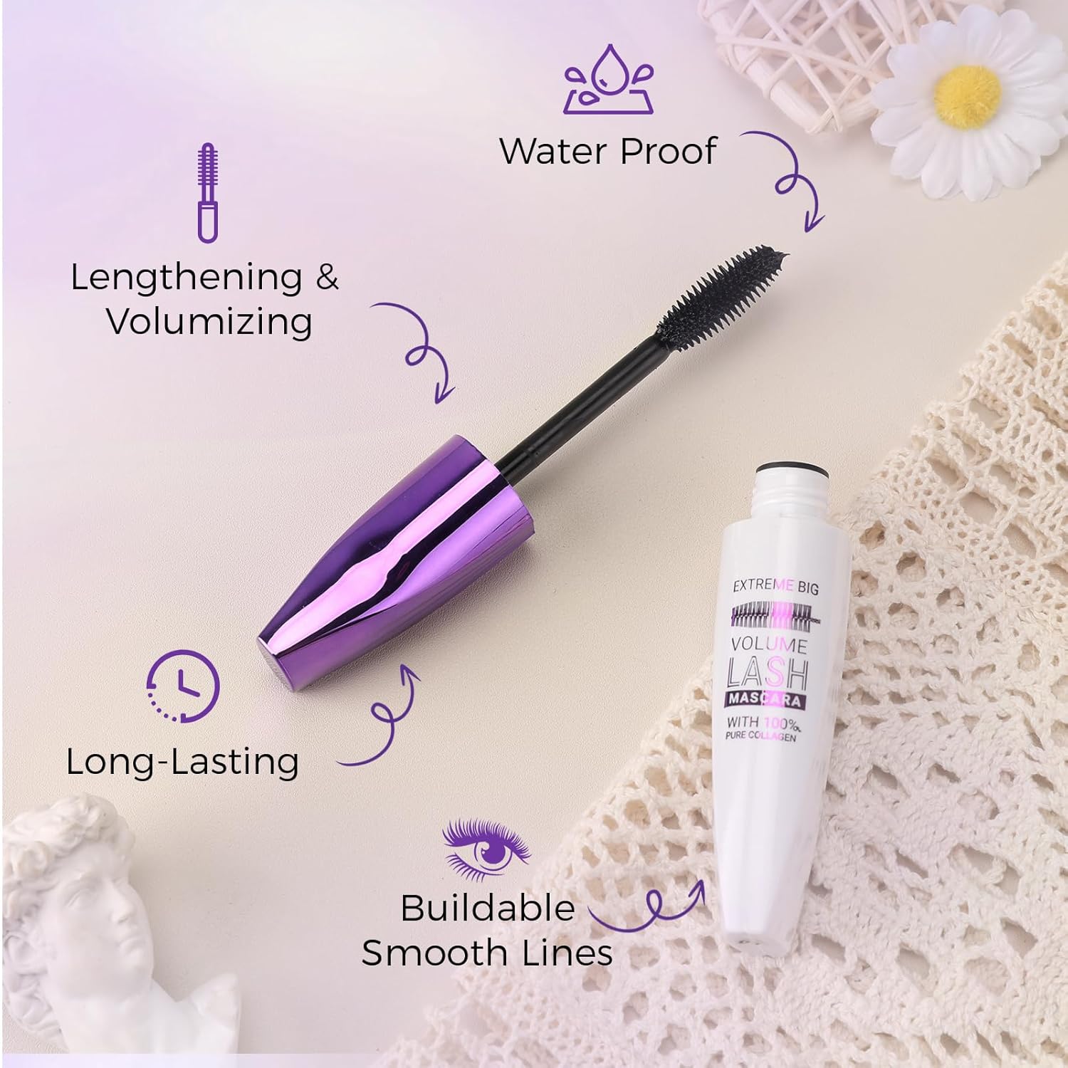 - VIBRANT COLOR OPTIONS – Our mascara comes in five highly-pigmented shades: Black, Brown, White, Blue, and Purple. Each shade delivers rich, vibrant color to enhance your lash look, whether subtle or bold—perfect for matching any mood, style, or occasion